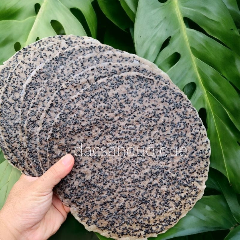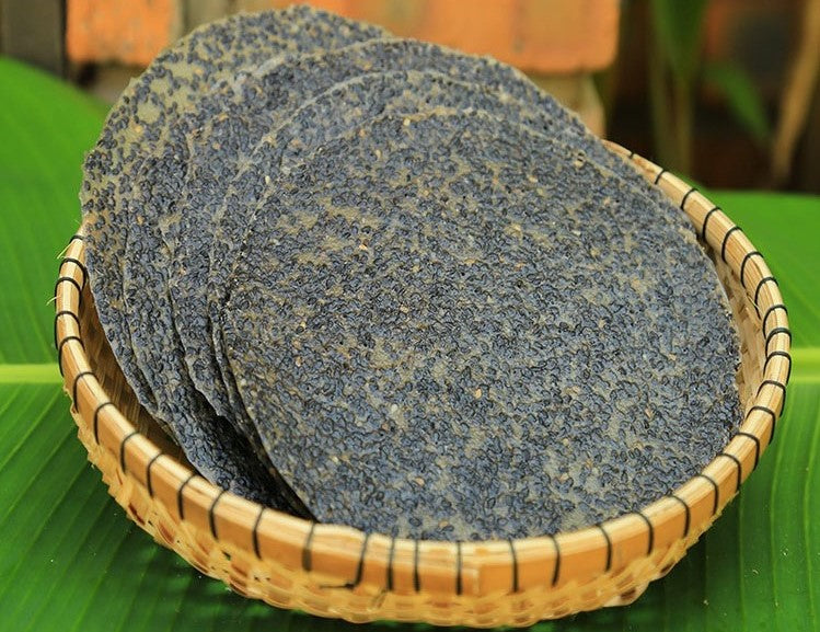 - Bánh hình tròn đường kính 22cm, thơm ngon, giòn tan với hương thơm của mè đen & cơm dừa khi nướng lên, thích hợp cho các món gỏi hoặc ăn vặt gia đình.