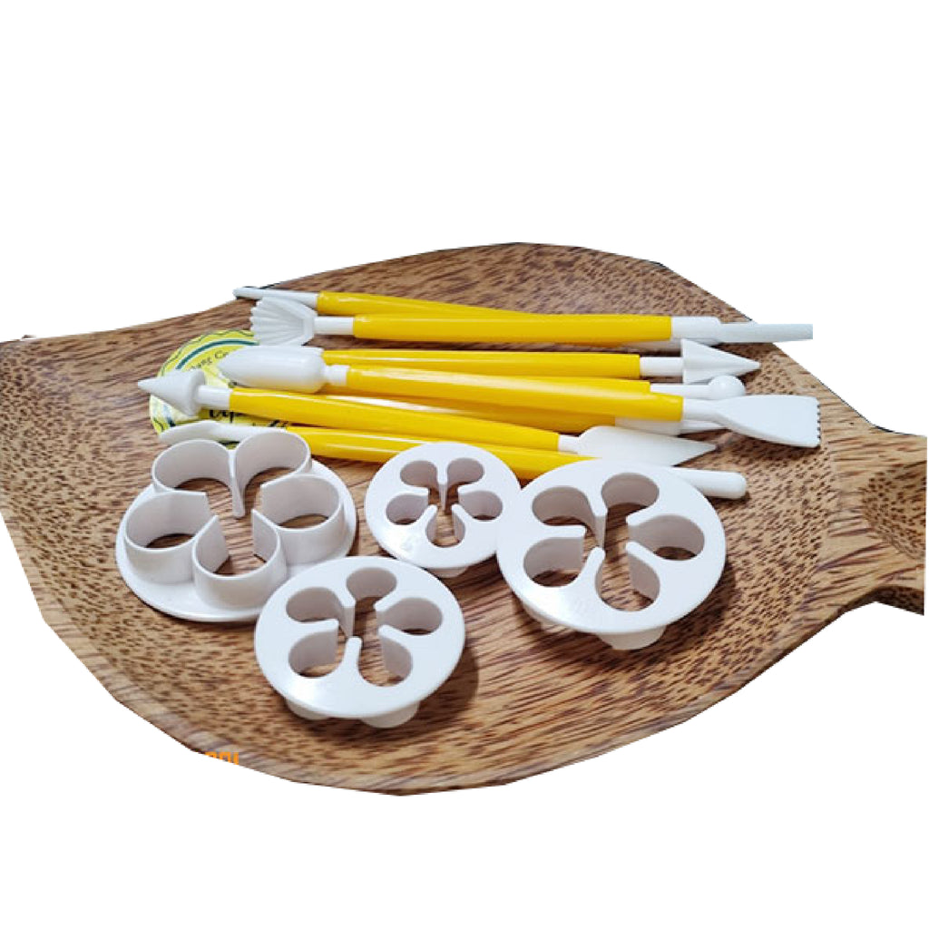 Bộ fondant với nhiều chi tiết bao gồm 12 món. Đó là dụng cụ cắt hình hoa, các dụng cụ tạo nên hình vân, gân lá, tạo độ cong…