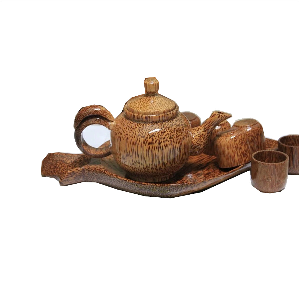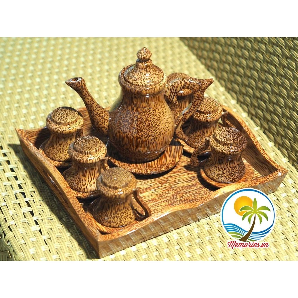 – Sản phẩm được làm từ gỗ của thân cây dừa, được khắc và đánh bóng tinh xảo, rất bền, đẹp và sang trọng, được sản xuất tại Bến Tre. Sản phẩm gồm: 1 bình trà có nắp, 1 cái đĩa hình chiếc lá, 6 cái ly nhỏ.