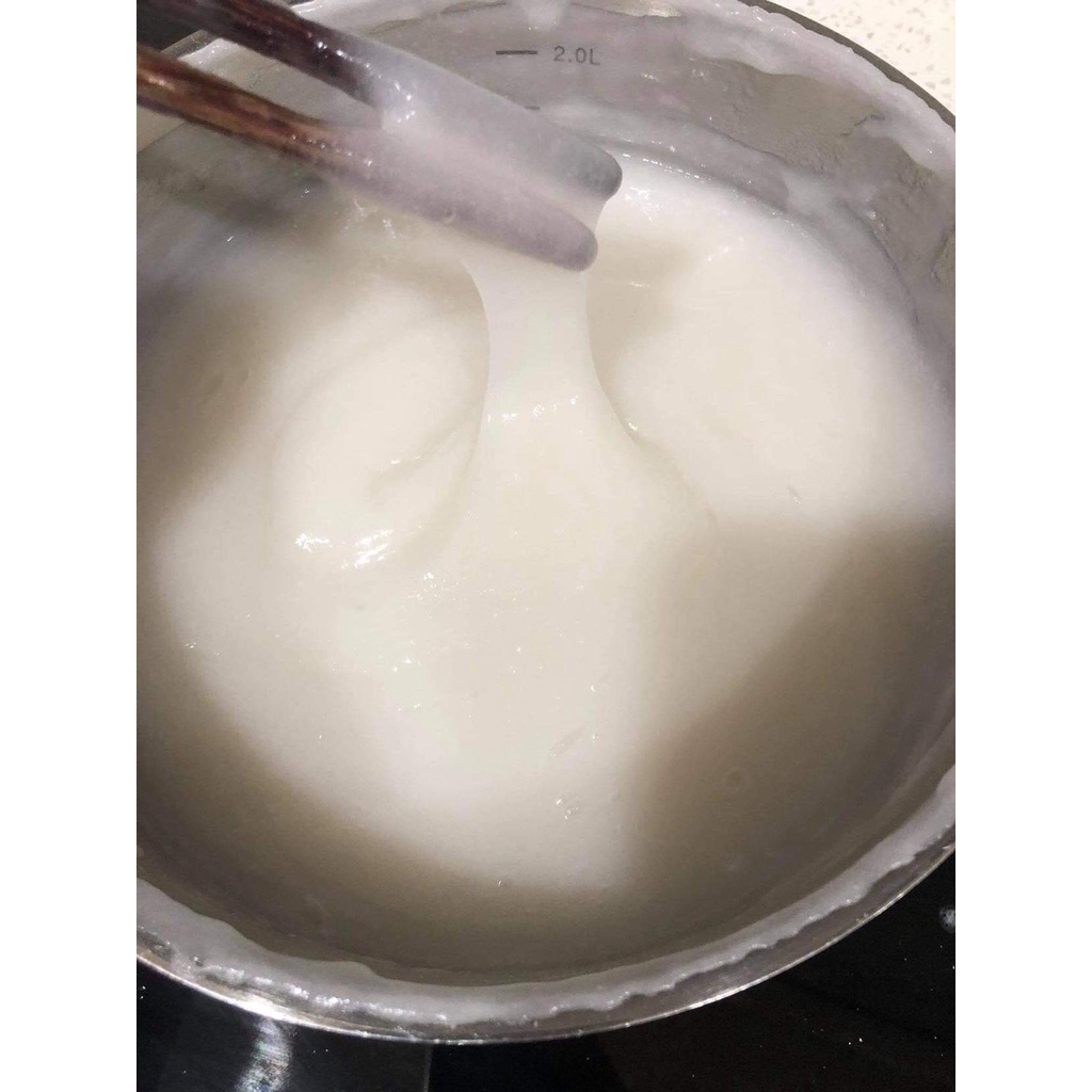 - Bắc nồi bột lên bếp, để nhiệt nấu ở mức trung bình, dùng đũa quấy đều liên tục trong quá trình nấu để hỗn hợp không bị bén đáy nồi,quan sát xem nếu bột đặc quá có thể chế thêm nước, nếu vừa rồi thì thôi
