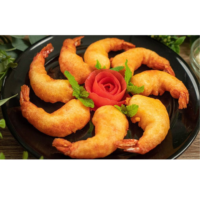 -Bước 3: Sau đó đem chiên ở nhiệt độ 170oC 175oC. Khi chiên dùng muỗng rưới từ từ hỗn hợp bột đã pha sẵn trực tiếp lên tôm