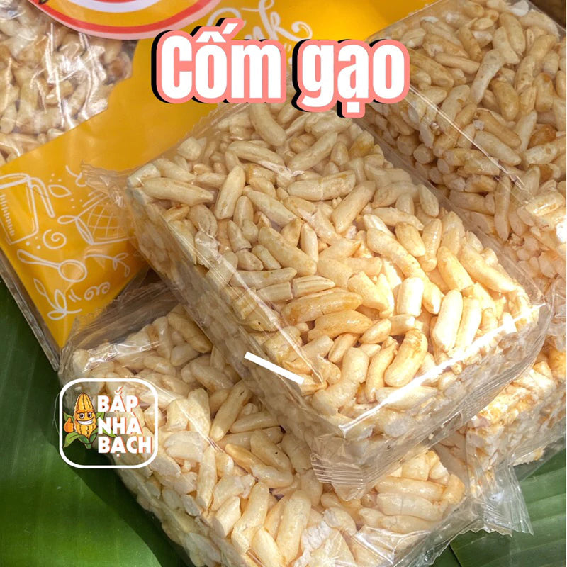 Bánh cốm gạo được làm thủ công với gạo được nổ ở nhiệt độ cao, ngào với đường mạch nha giúp gạo kết dính lại với nhau. Được cán dẹp tạo khuôn tạo nên những miếng cốm gạo xinh đẹp gửi đến bạn sự truyền thống của món ăn vặt của những năm 9x