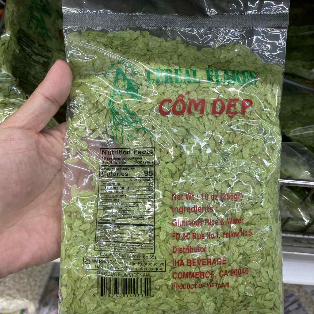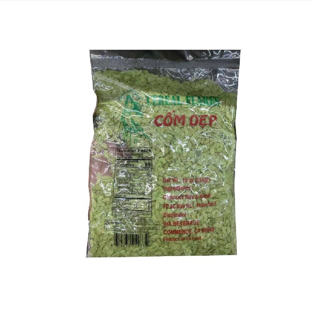 Cốm khô có màu xanh nhẹ tự nhiên k nhuộm phẩm màu, ăn có vị ngọt mát.