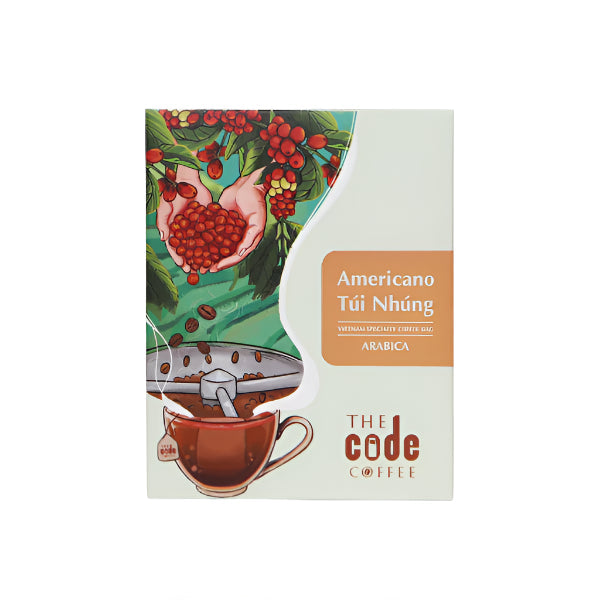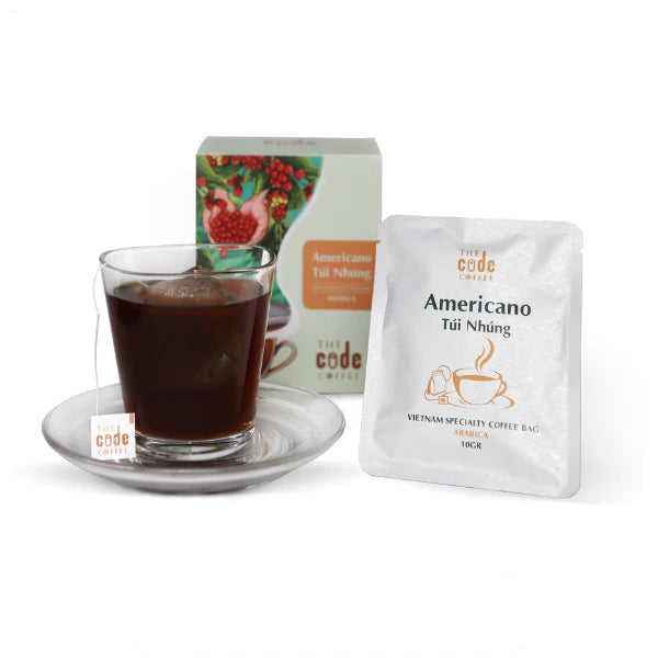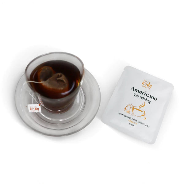 CÀ PHÊ AMERICANO TÚI NHÚNG được làm từ 100% cà phê nguyên chất có nguồn gốc từ những trái Arabica đặc sản được trồng tại nông trại cà phê dãy cao nguyên Langbiang Cầu đất. Cà phê được hái chín thủ công và sơ chế theo tiêu chuẩn cao. Sản phẩm cà phê rang mộc tự nhiên cho hương thơm thuần của cà phê, không có chất tạo mùi, chất tạo đắng và có vị ngọt dài. CÀ PHÊ TÚI NHÚNG của The Code Coffee có hương thơm cà phê đậm đà, vị thanh mát, chua nhẹ của giống cà phê Chè Arabica, với hàm lượng cafein thấp, đảm bảo giúp bạn tỉnh táo mà không gây mất ngủ.
