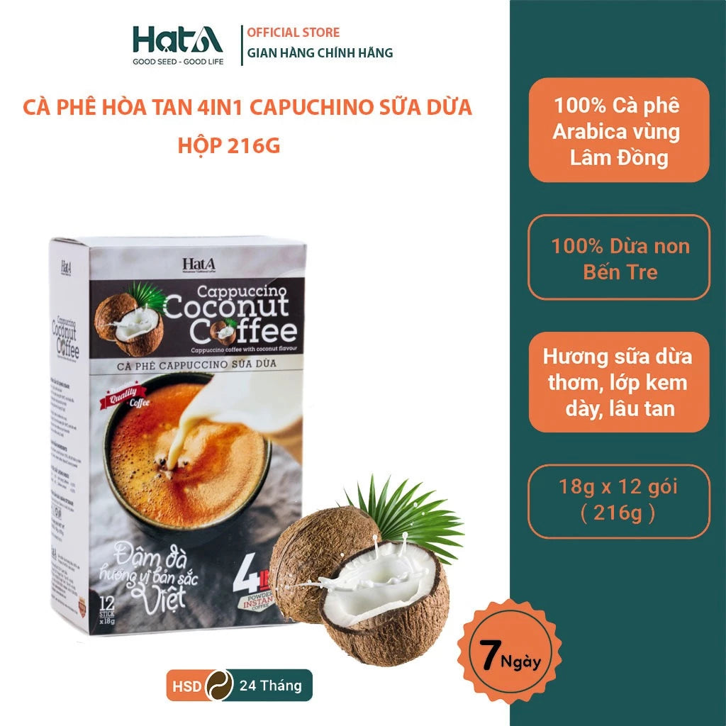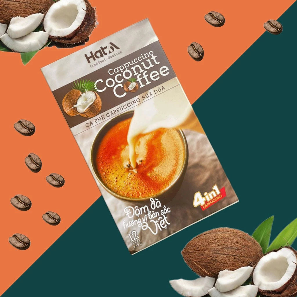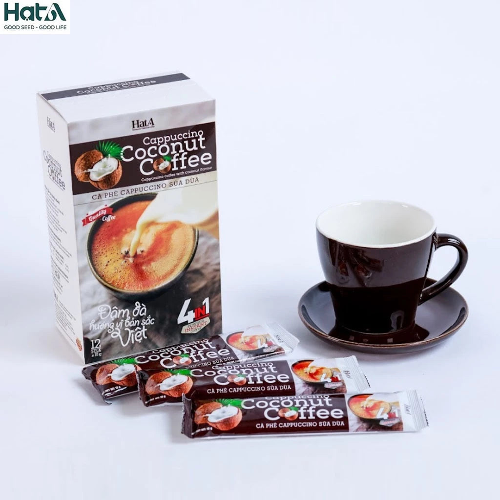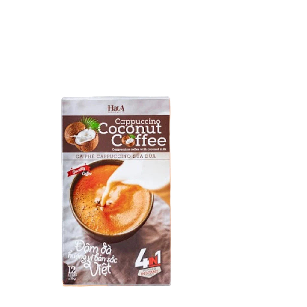Cà phê hòa tan Cappuccino Hạt A Cafe 4in1 vị sữa dừa tự nhiên 216gr/12 gói là sự kết hợp hòa quyện giữa cà phê và cốt dừa non cùng với một lớp kem mỏng béo ngậy tạo nên sản phẩm cafe dừa đậm đà hương vị Việt Nam.