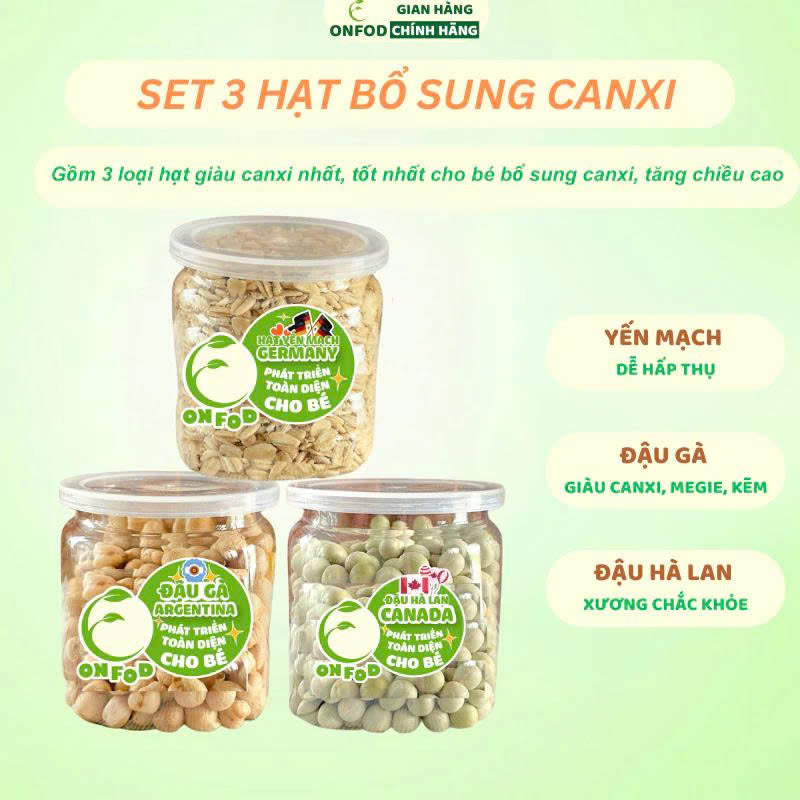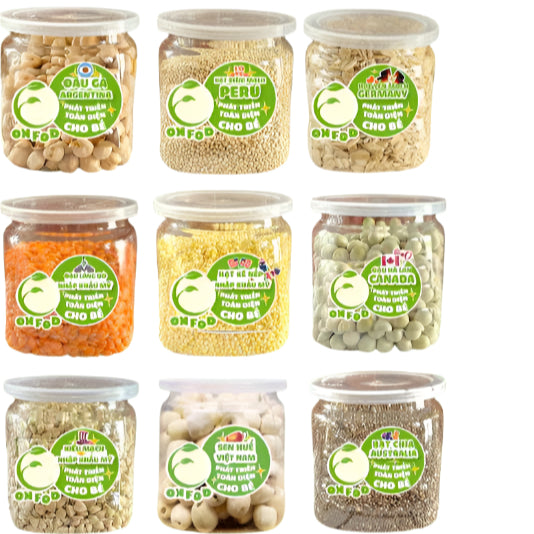 Combo 9 loại hạt quý ONFOD nhập khẩu chứa nhiều vitamin và dinh dưỡng tốt cho não bộ & cơ thể của trẻ bao gồm: Yến Mạch Sữa, Đậu Hà Lan, Đậu Lăng Đỏ, Đậu Gà, Hạt Diêm Mạch, Hạt Kiều Mạch, Hạt Kê Nếp, Hạt Chia, Hạt Vừng (mè).