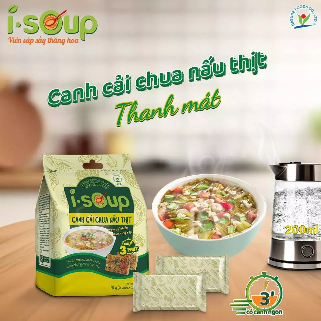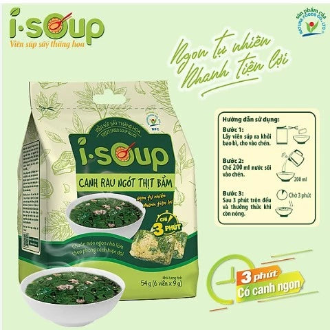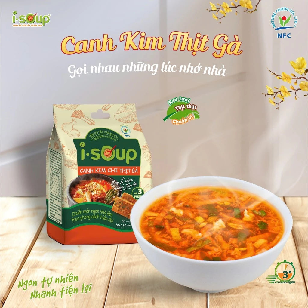 Tuy nhiên, sẽ mất nhiều thời gian trong việc chọn mua nguyên liệu tươi, sơ chế và nêm nếm công phu. Thấu hiểu những mong muốn ăn nhanh - ăn đủ - đa dạng NFC chúng tôi đã nghiên cứu áp dụng công nghệ sấy thăng hoa tiên tiến từ Nhật Bản để mang đến dòng sản phẩm canh ăn liền Viên súp sấy thăng hoa mang thương hiệu I-Soup cùng với 3 vị canh: Rong biển thịt gà, Kim chi thịt gà và Cải Xoong nấu thịt.