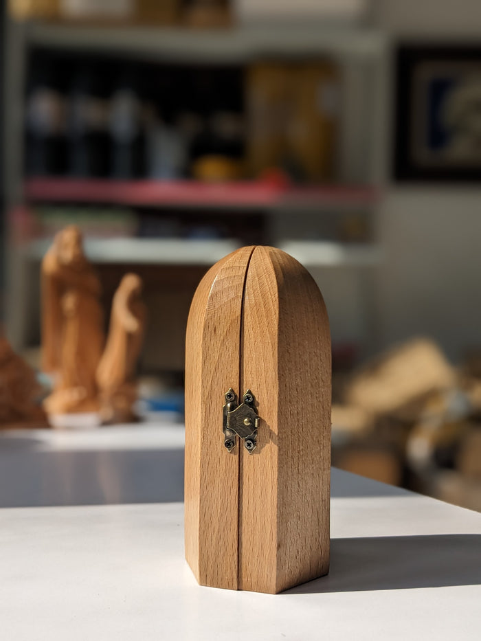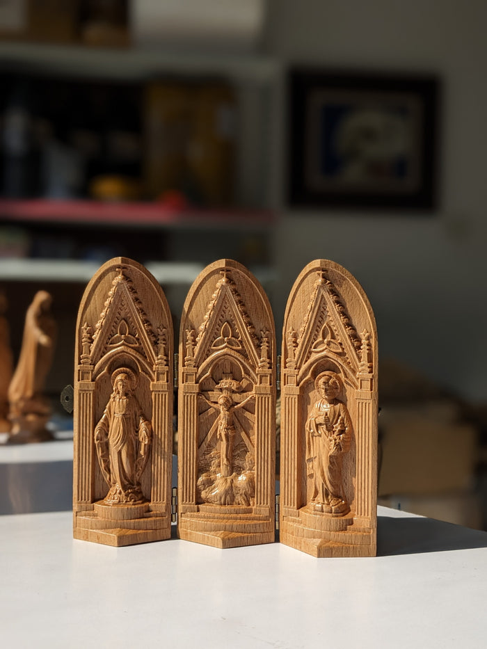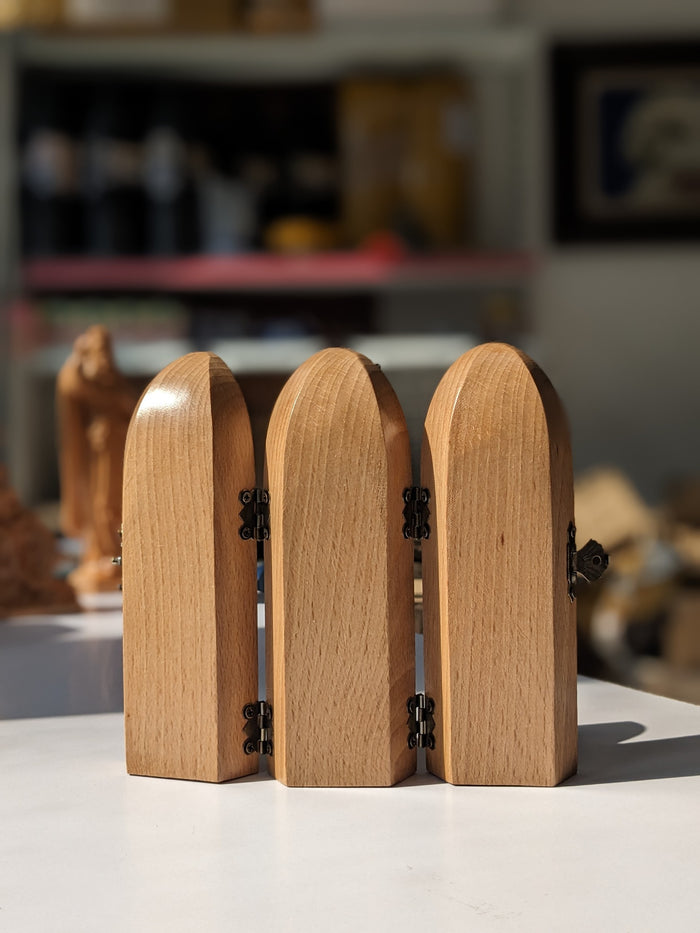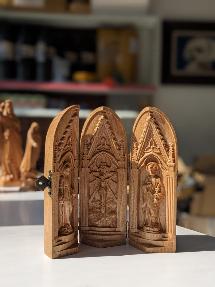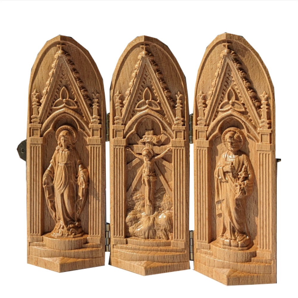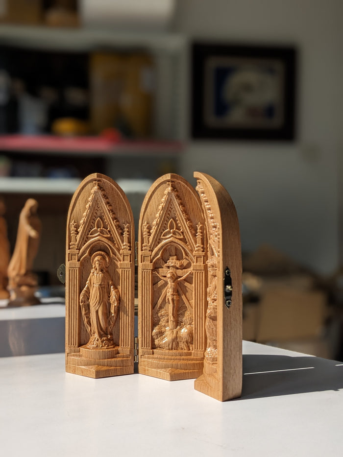 The Catholic altar is exquisitely engraved on high quality Beech wood imported from Germany and is uniquely designed so that when put together, a very compact circular cylindrical block.