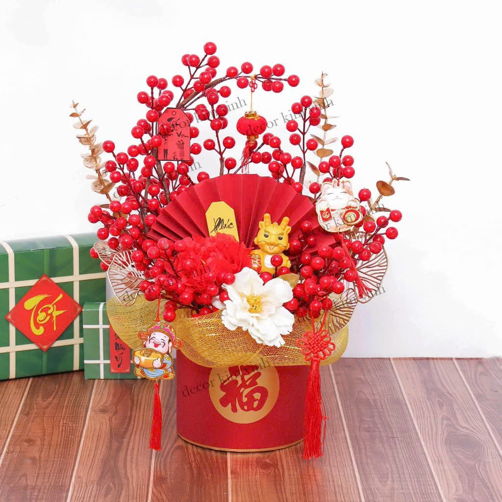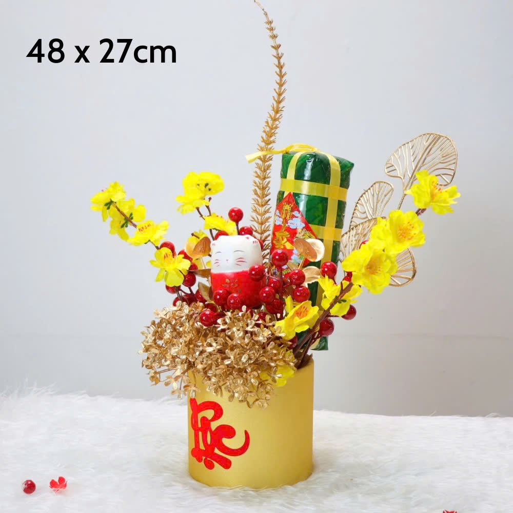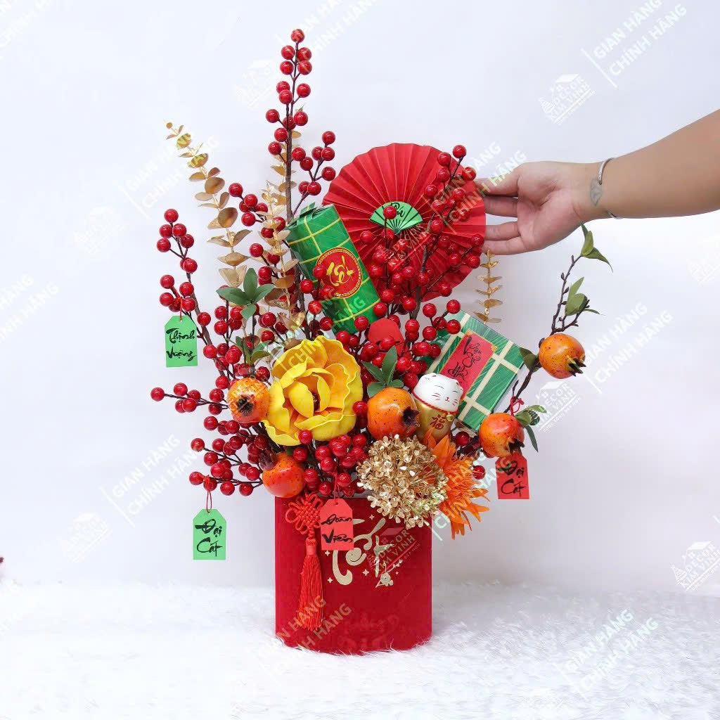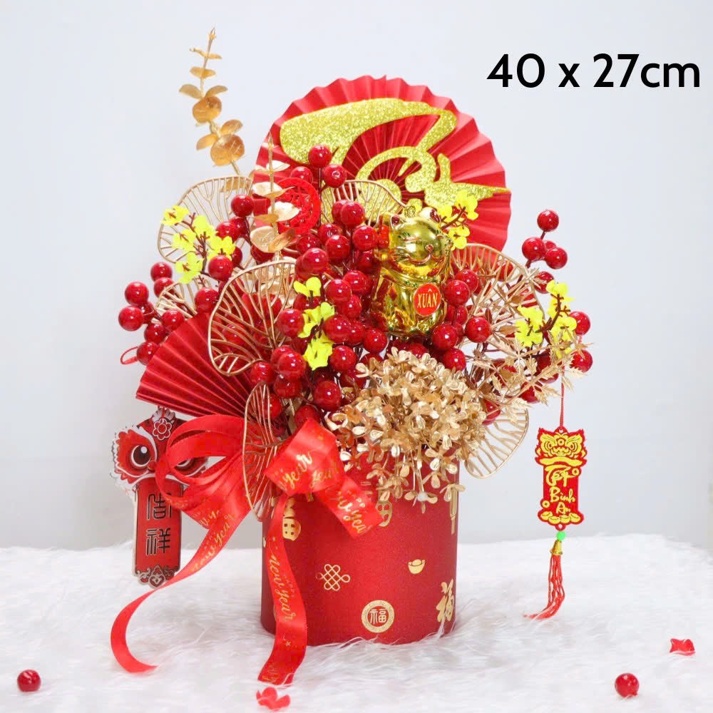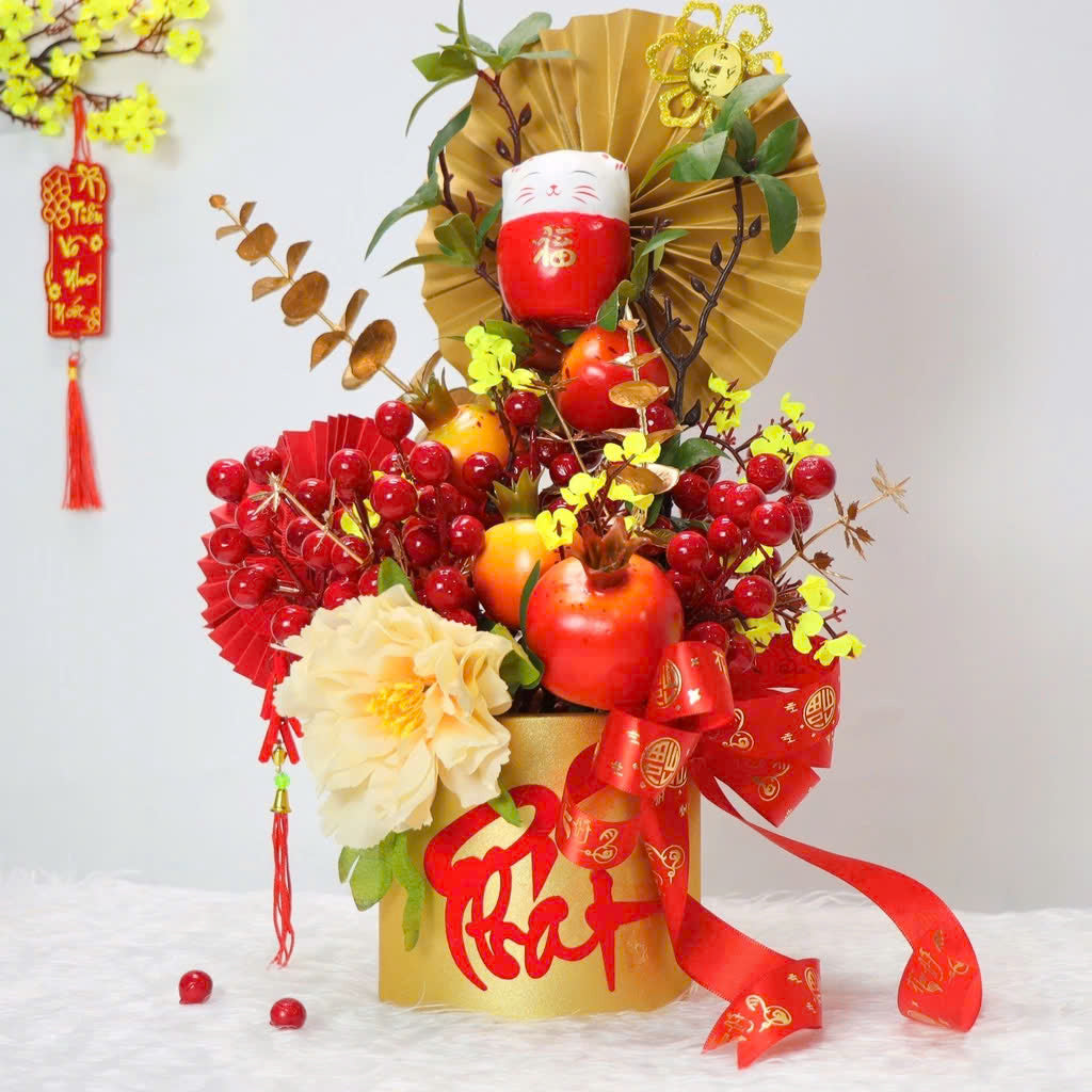 ✅ Chậu được trang trí theo chủ đề Tết với gam màu đỏ vàng sặc sỡ là biểu tượng cho sự thịnh vượng, may mắn, sung túc giàu sang cho gia chủ.