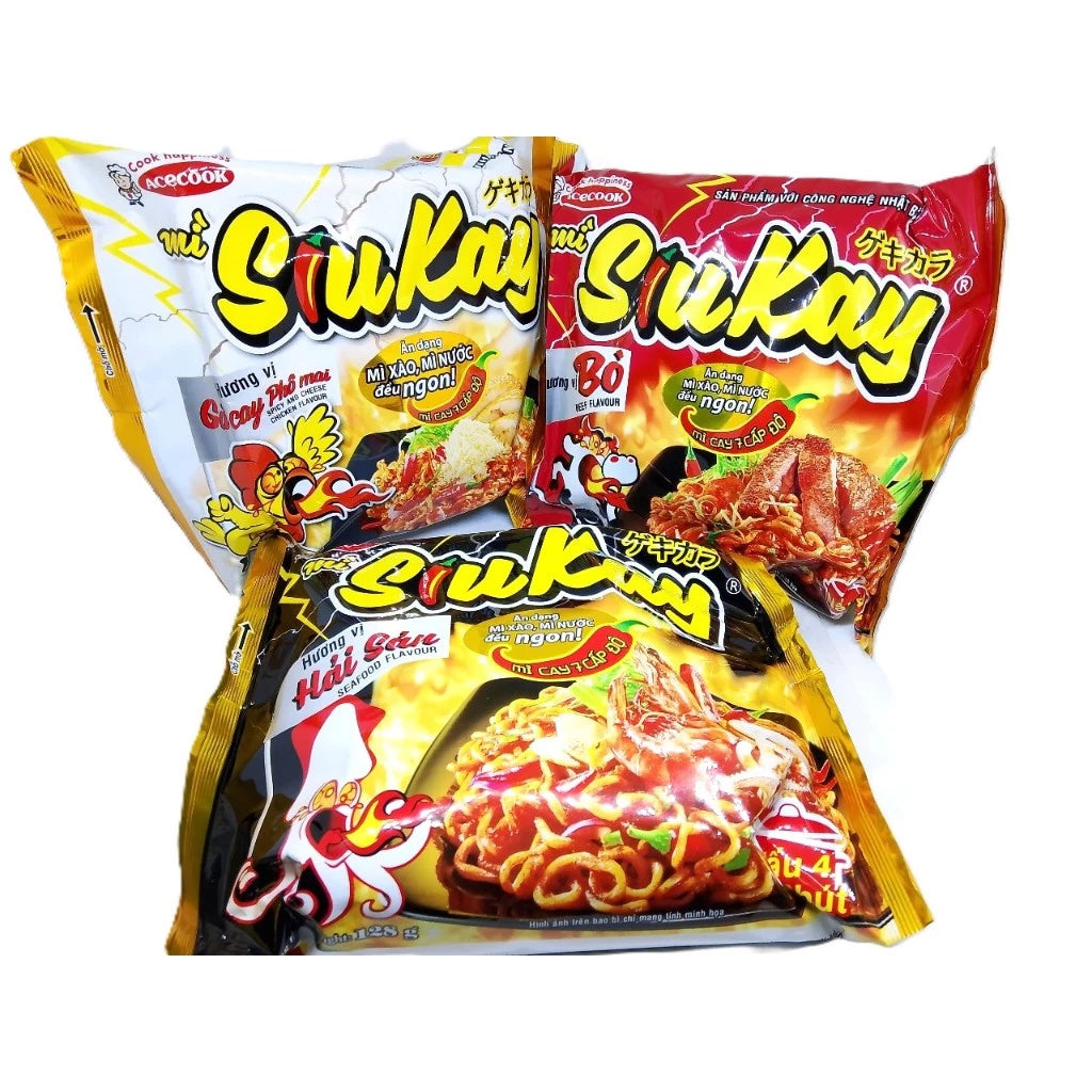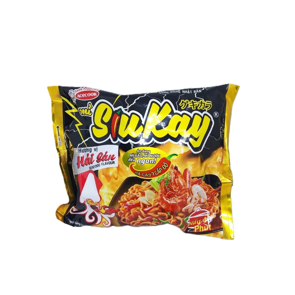 Mì Siukay Acecook - Sản phẩm là mì dạng nấu 4 phút, với sự kết hợp tuyệt vời của nước súp ngon ngọt đậm đà từ hải sản và vị cay của ớt thẩm thấu tận sâu vào bên trong sợi mì khiến người dùng thăng hoa với độ cay xé lưỡi, và sau đó là cảm giác khoan khoái vượt qua nỗi đau ngọt ngào.