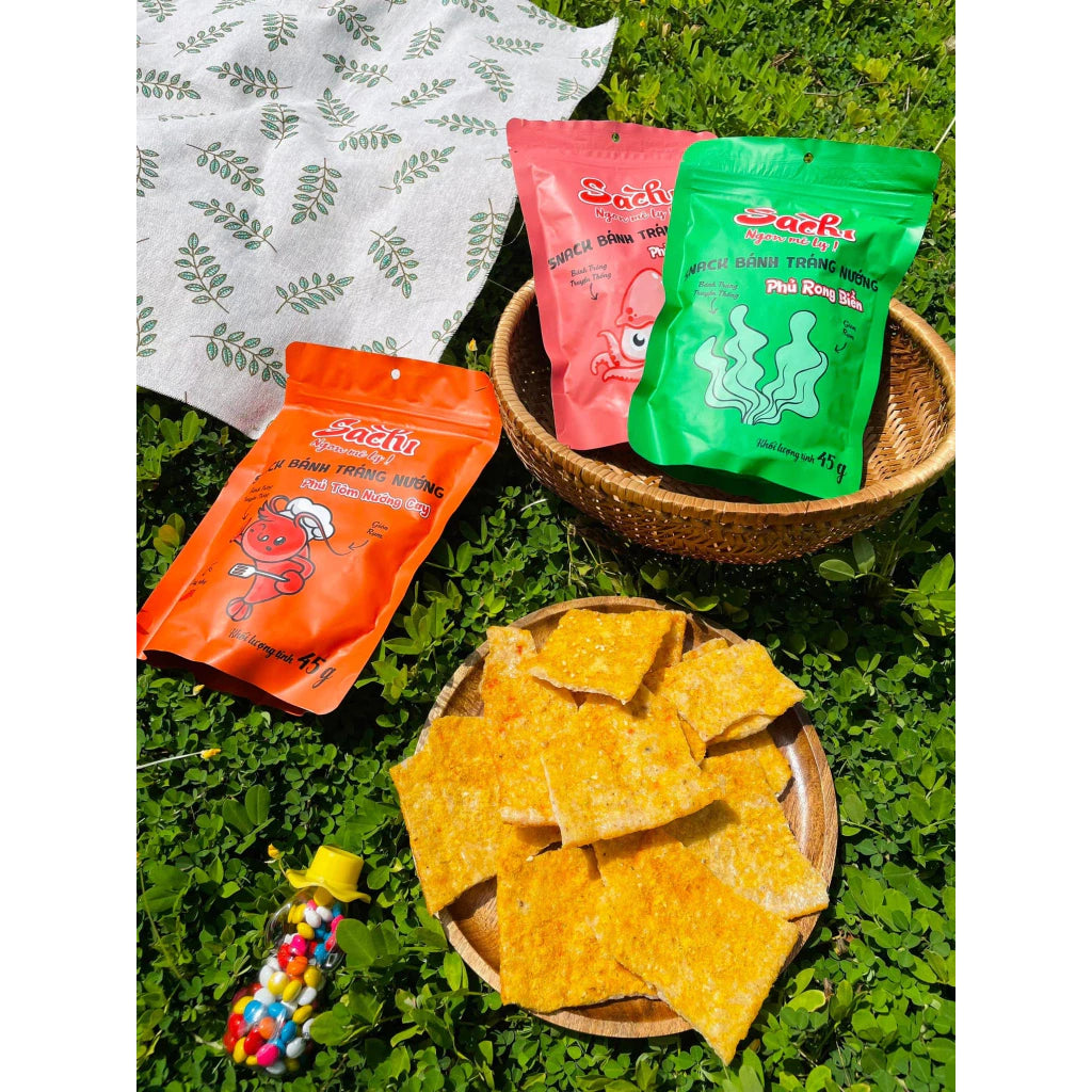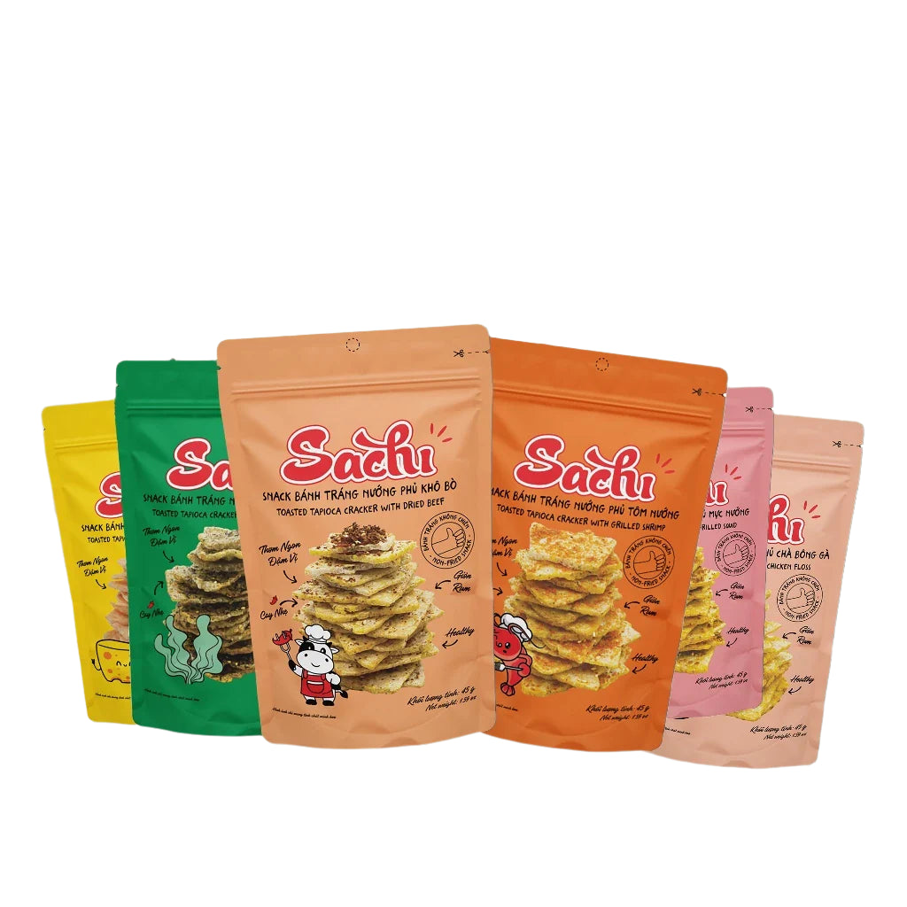 Snack BÁNH TRÁNG NƯỚNG SACHI PHỦ GIA VỊ được sản xuất và đóng gói hoàn toàn tại Việt Nam, đầy đủ các chứng nhận An Toàn Thực Phẩm, ISO đảm bảo chất lượng cao nhất đến tay người tiêu dùng. Nguồn nguyên liệu hoàn toàn tự nhiên không dùng hoá chất hay chất bảo quản. Nền bánh tráng nướng làm từ gạo Bình Định, dừa Tam Quan được nướng bằng công nghệ độc quyền, hiện đại và vẫn giữ được độ giòn tan béo ngậy truyền thống.