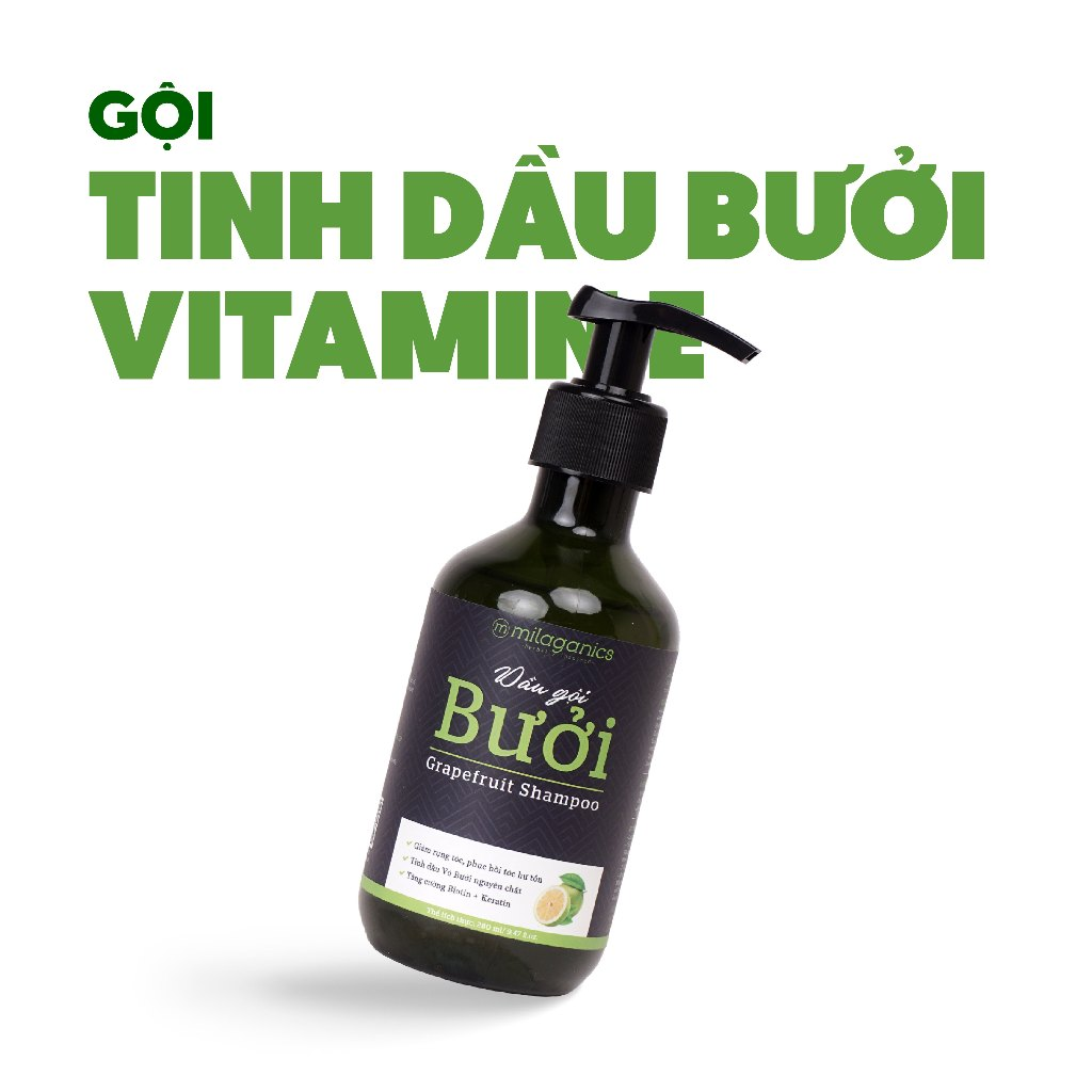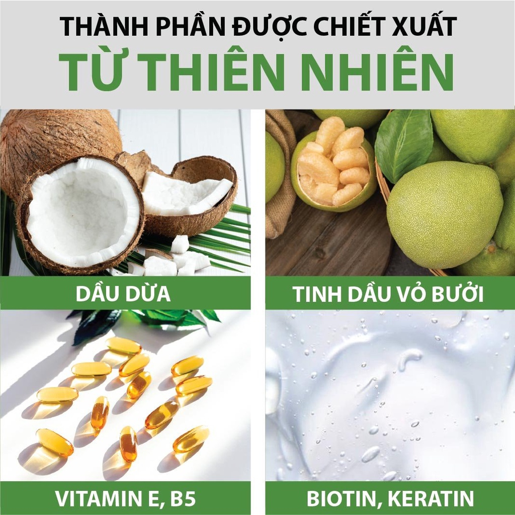 - Dầu gội bưởi: Tinh dầu Bưởi, chiết xuất Củ Cải Đường, dầu Mù U, chiết xuất cây Phỉ, chiết xuất Nha Đam tươi, Keratin, Biotin, Vitamin B5 và Vitamin E
