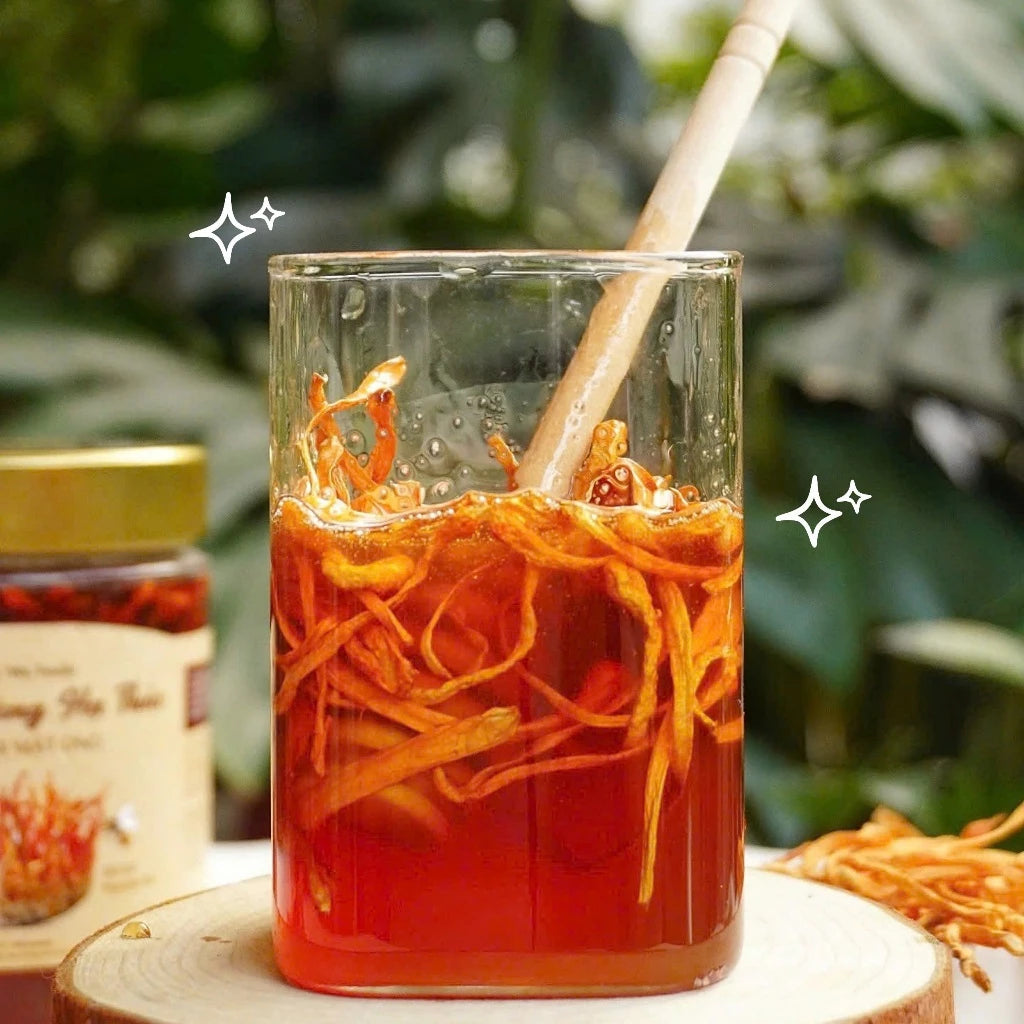 - Cách 1: Cho 20ml - 30ml mật ong đông trùng hạ thảo pha với 200ml - 300ml nước ấm (40-60 độ C)