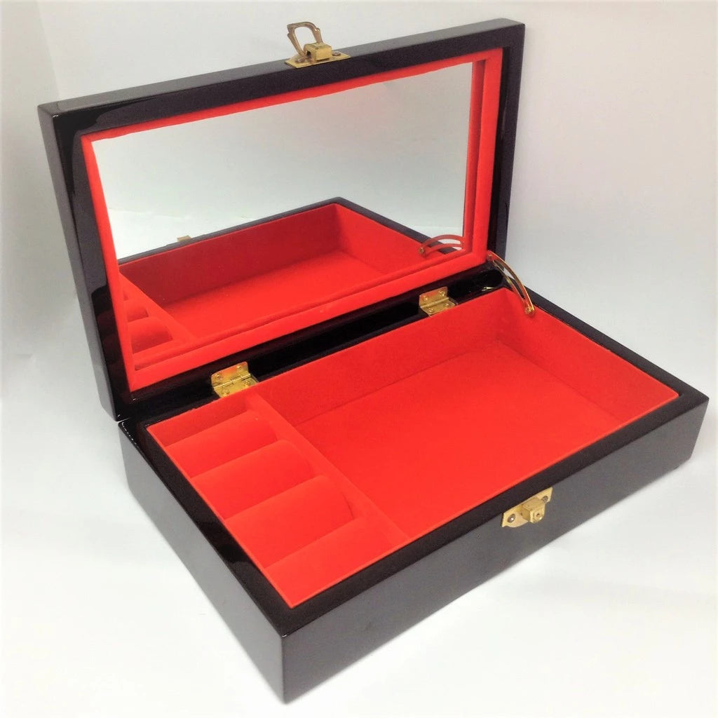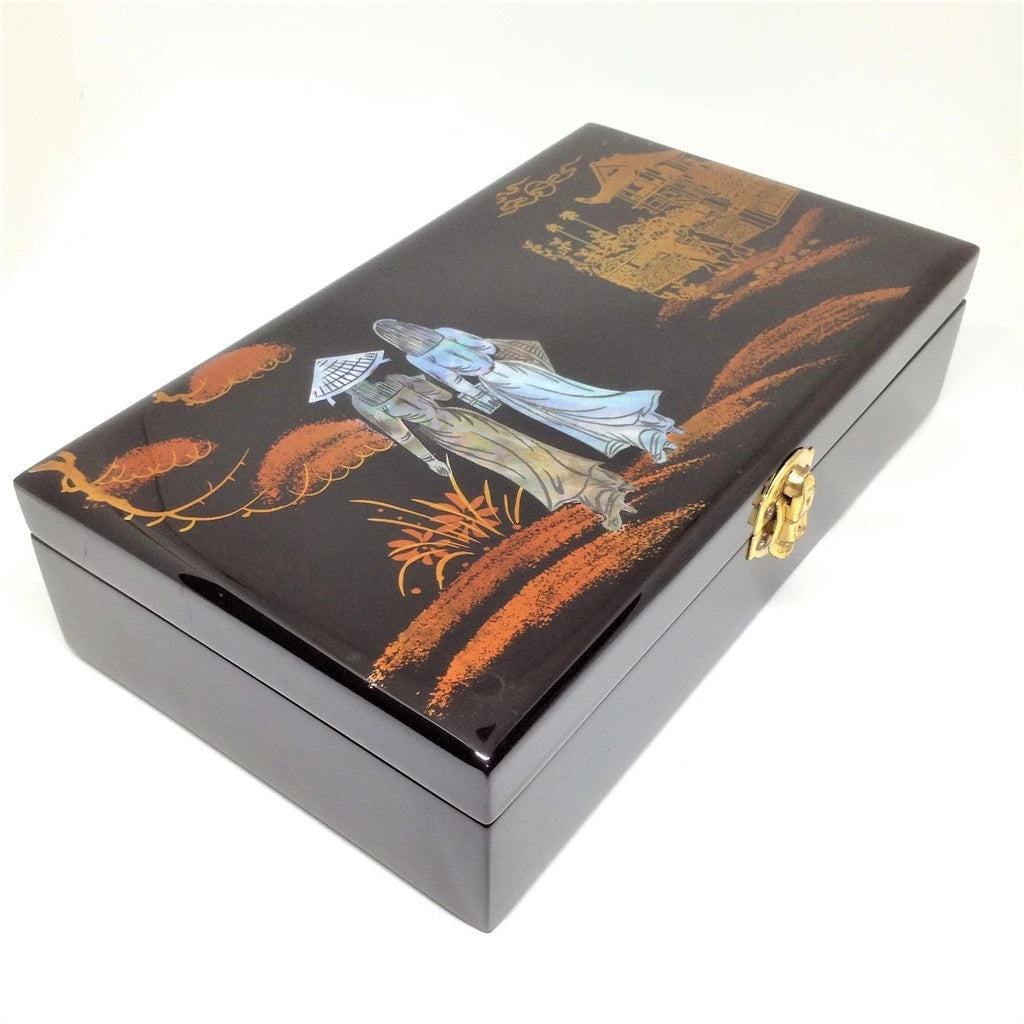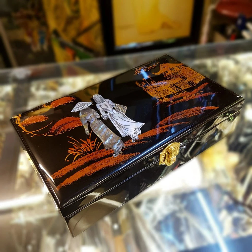 Sản phẩm được làm từ chất liệu gỗ cẩm lai sơn mài, cẩn ốc xà cừ và phủ bóng giúp màu sắc đẹp lâu bền theo thời gian. Hộp có thiết kế chắc chắn, sáng đẹp, sẽ là điểm nhấn đặc biệt cho căn phòng của bạn, vừa đem lại cảm giác sang trọng, vừa mang đậm nét truyền thống của Việt Nam. Bên trong hộp có lót nhung đỏ, có gắn gương soi tiện lợi.