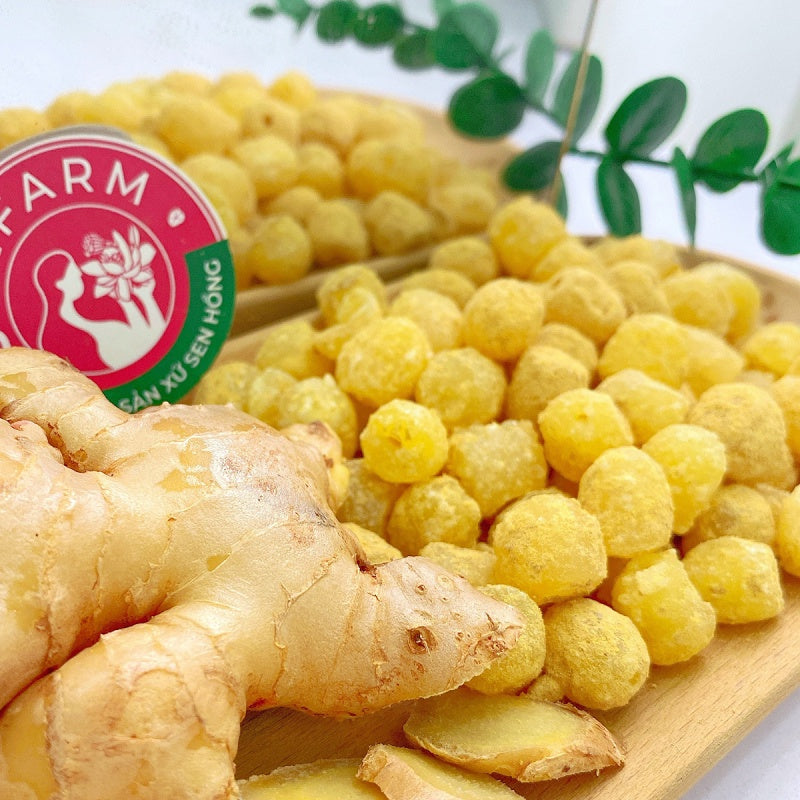 Mứt sen vị gừng xốp dẻo mang đến hương vị lạ miệng, một chút cay the - thơm nồng của gừng, ngọt - thanh - mát của hạt sen tạo nên hương vị hấp dẫn