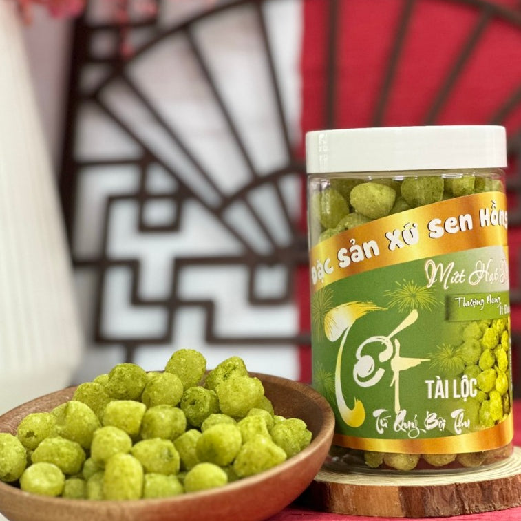 Hương vị của trà xanh hòa trong một lớp đường mỏng quyện với hạt sen bùi bùi làm nên viên mứt mang một chút thơm, một chút béo, một chút mê mẩn. Mứt sen trà xanh với những hạt mứt bùi bùi, béo thơm vị ngọt nhẹ nhàng thanh tao đánh thức mọi giác quan của người dùng. Màu trà xanh giúp món mứt trông thêm đẹp mắt và có được hương vị đặc trưng riêng