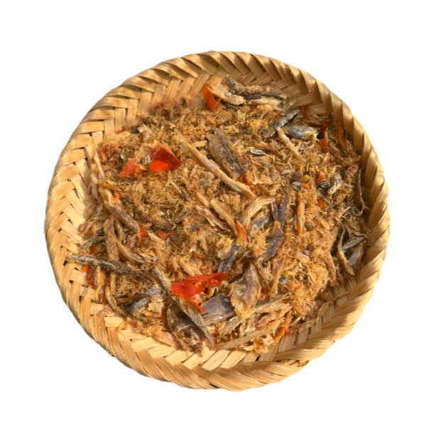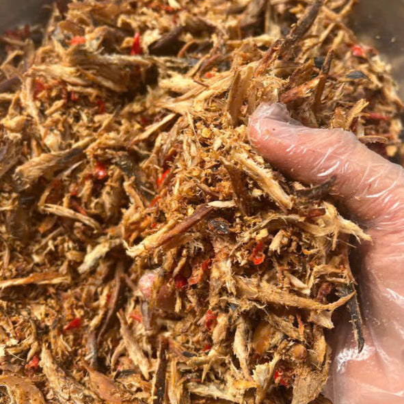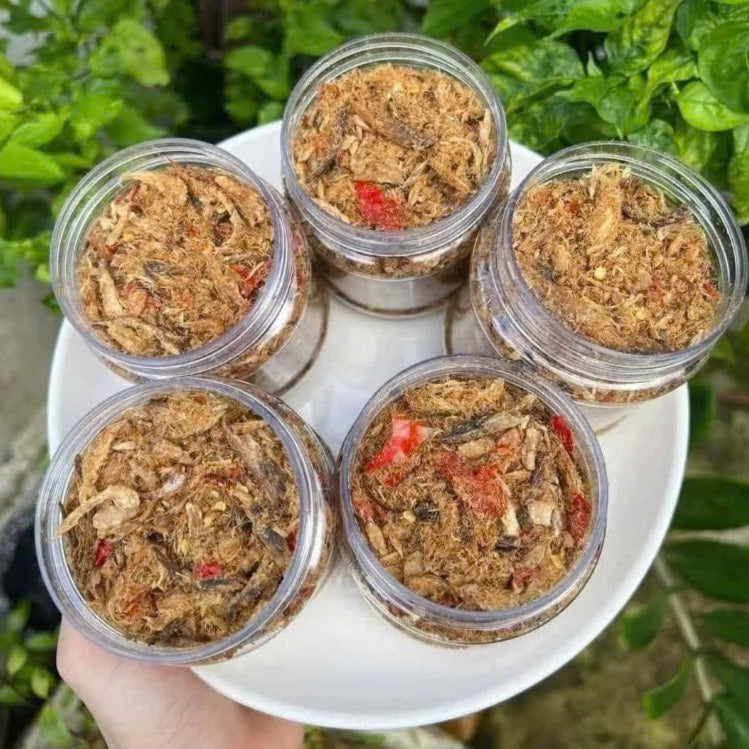 Cá nục biển loại 1 sau khi được chọn lọc kỹ lưỡng sẽ trải qua quy trình phơi tự nhiên, sau đó nướng lên và giã tay với tỏi ớt bằng cối đá, hòa quyện cùng các gia vị đặc trưng như lá chanh ta, hạt dổi, mắc khén để tạo nên một món ăn đậm đà khó quên. Sản phẩm được đựng trong hũ pet tiện lợi, dễ dàng bảo quản và sử dụng trong mọi tình huống.
