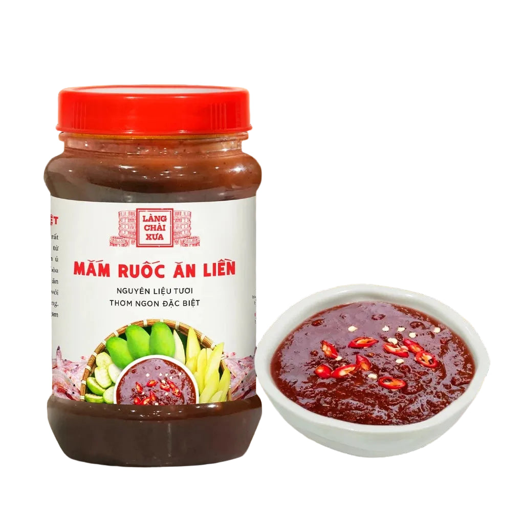 - Mắm ruốc tỏi ớt Làng Chài Xưa rất thơm ngon và đặc biệt, được làm công phu từ me tỏi ớt tươi. Mắm ruốc tỏi ớt ủ thùng gỗ, muối tinh khiết, tỏi, ớt tươi, hòa quyện nồng nàn giúp món ăn ngon hơn rất nhiều. Đặc biệt là ăn với trái cây, bánh tráng, cơm nóng.