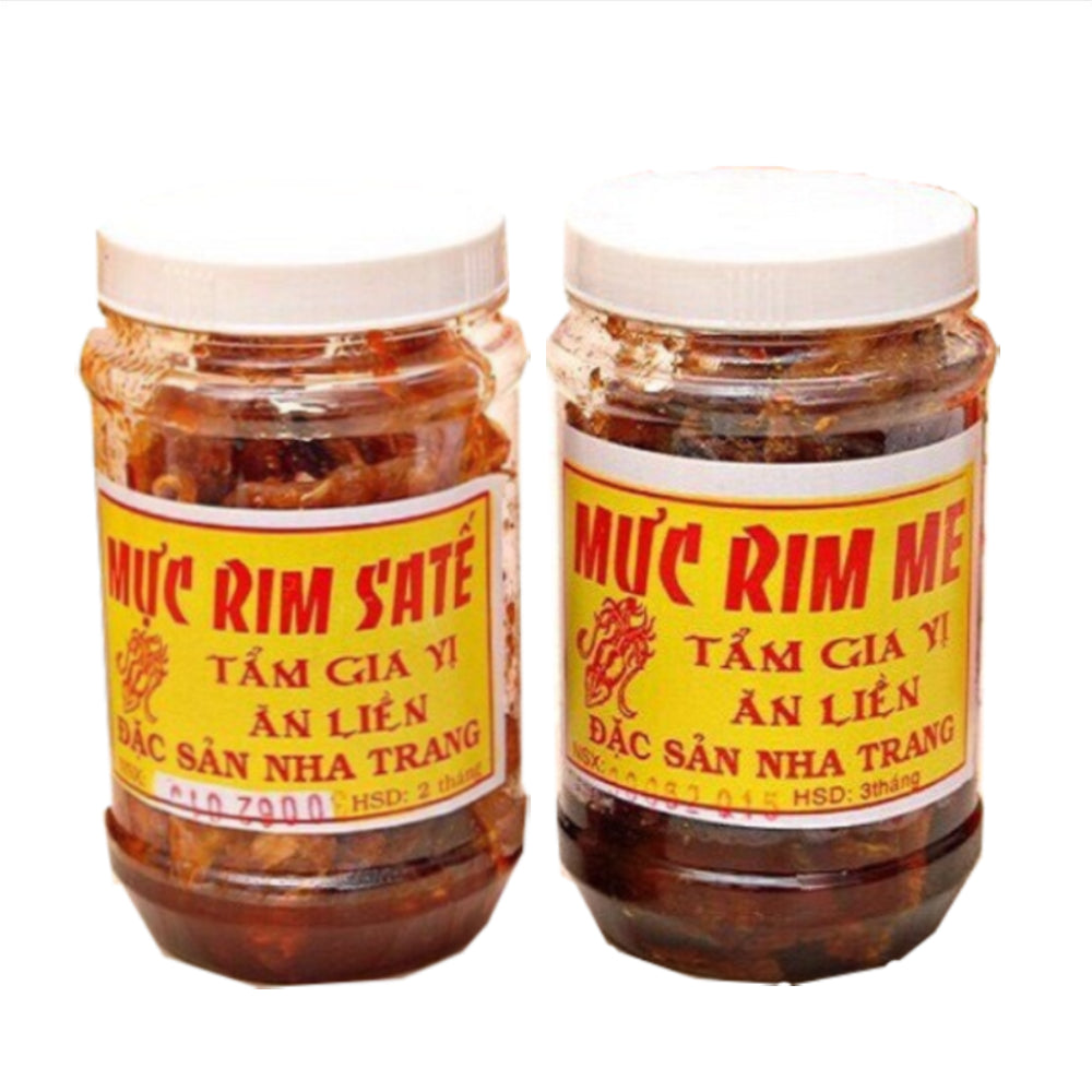 Mực rim me/mực rim sate nguyên con là món đặc sản vô cùng nổi tiếng ở Nha Trang. Mực được làm từ loại mực sữa, hòa quyện với nước sốt me chua chua ngọt ngọt, có vị cay cay, bùi bùi của mực. Ăn một lần nghiền mãi