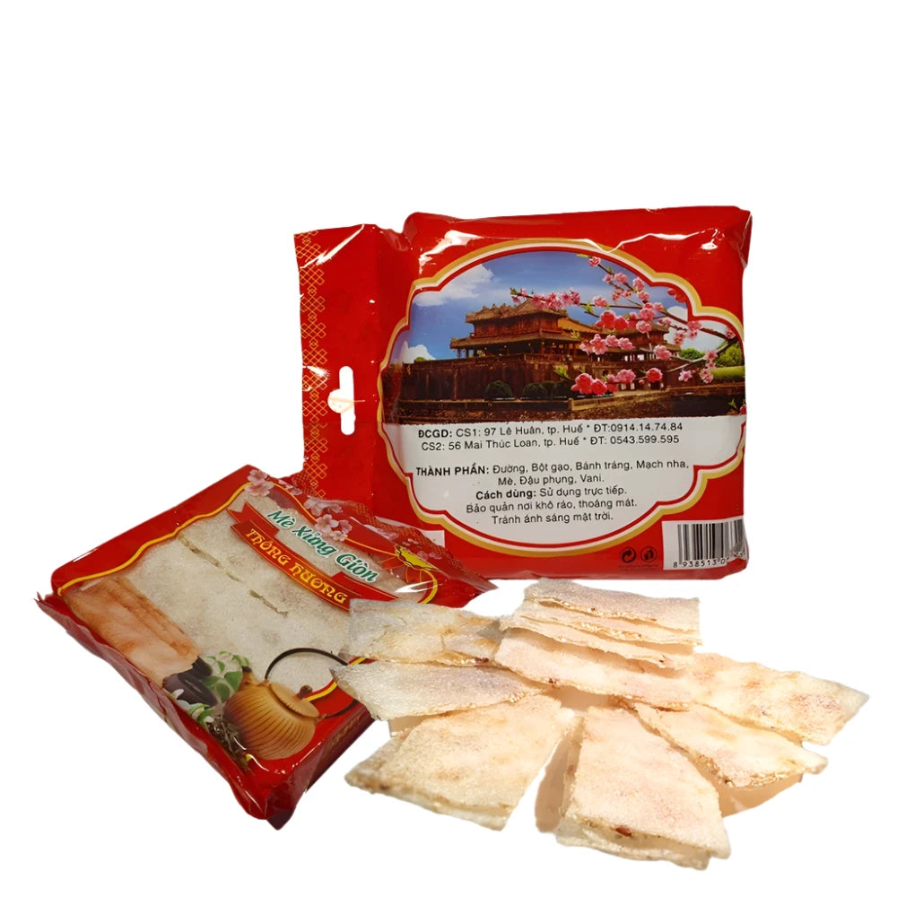Mè xửng giòn khác biệt mè xửng truyền thống ở lớp bánh đa bên ngoài. Phần nhân mỏng kết hợp với bánh đa, làm cho kẹo có độ ngọt vừa phải, hơi dai dai lại hơi giòn giòn