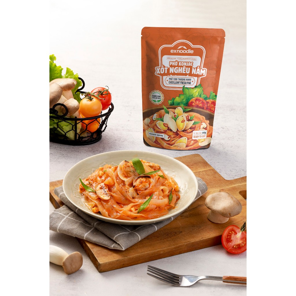 Phở Konjac xốt nghêu nấm: sợi phở Konjac dai giòn sật sật ngấm vị ngọt của thịt nghêu, sự thanh mát của cà chua và hương rau răm đặc sắc tạo nên hương vị độc đáo, đậm hương sắc bắc bộ