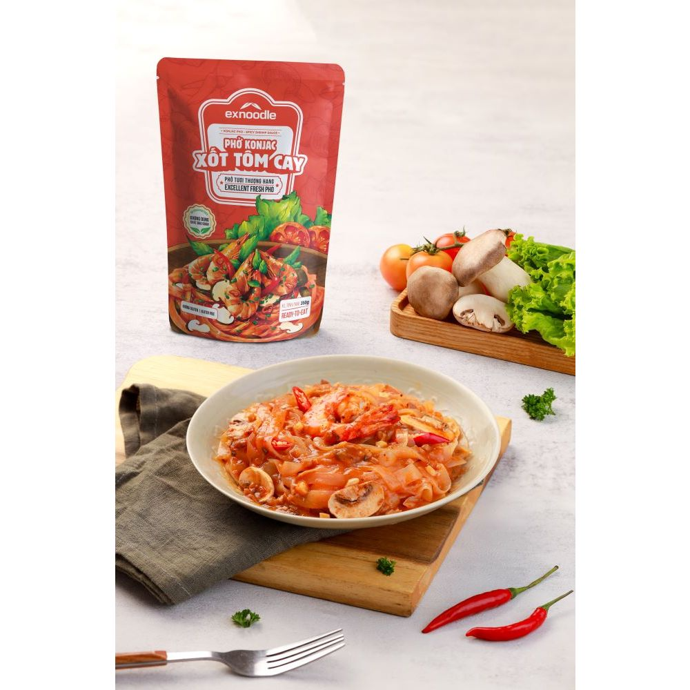 Phở Konjac xốt tôm cay: sợi phở konjac dai giòn sật sật ngấm vị ngọt của nấm, hương thơm đặc trưng của tôm kết hợp vị cay bùng nổ của ớt cùng sự đa dạng của quế, hồi, thảo quả tạo nên hương vị đặc biệt cuốn hút