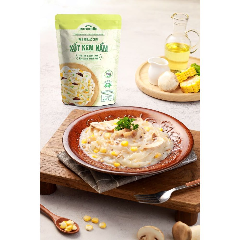 Phở Konjac chay - sốt kem nấm: sợi phở Konjac dai giòn sật sật ngấm vị ngọt của nấm cùng các nguyên liệu thực phẩm tươi ngon tạo nên hương vị đặc biệt cuốn hút
