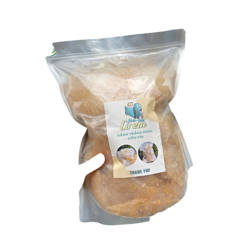 Bánh Tráng Muối Siêu Tỏi được trộn theo công thức độc quyền nhà Cô Em, được kết hợp từ tỏi phi nhà làm và muối độc quyền mang lại hương vị lạ miệng cho khách. Bánh Tráng được mix với tỏi phi, nguyên liệu nhà làm giúp dậy mùi thơm của bánh tráng.