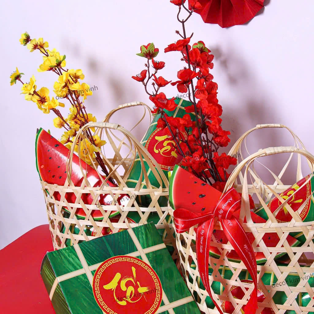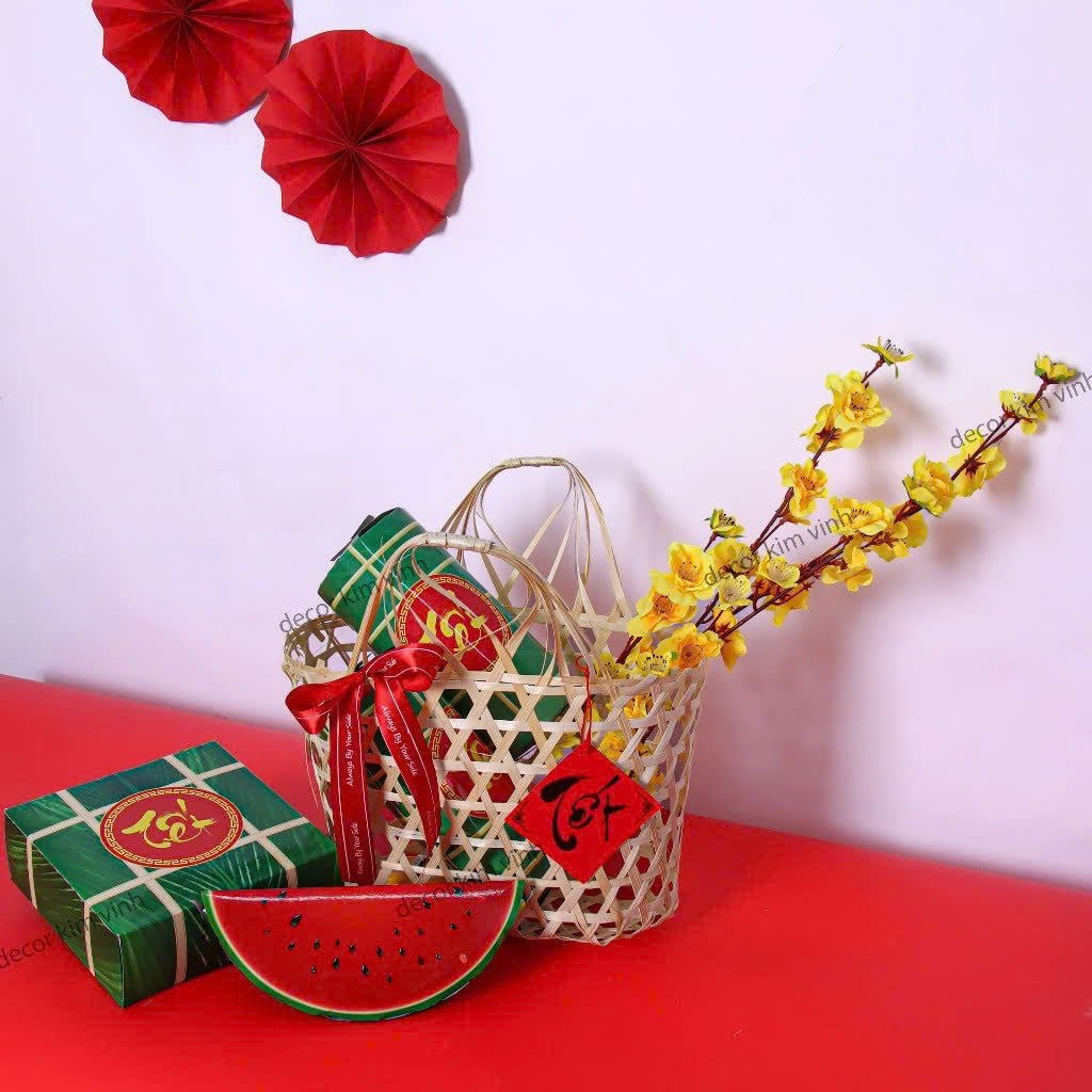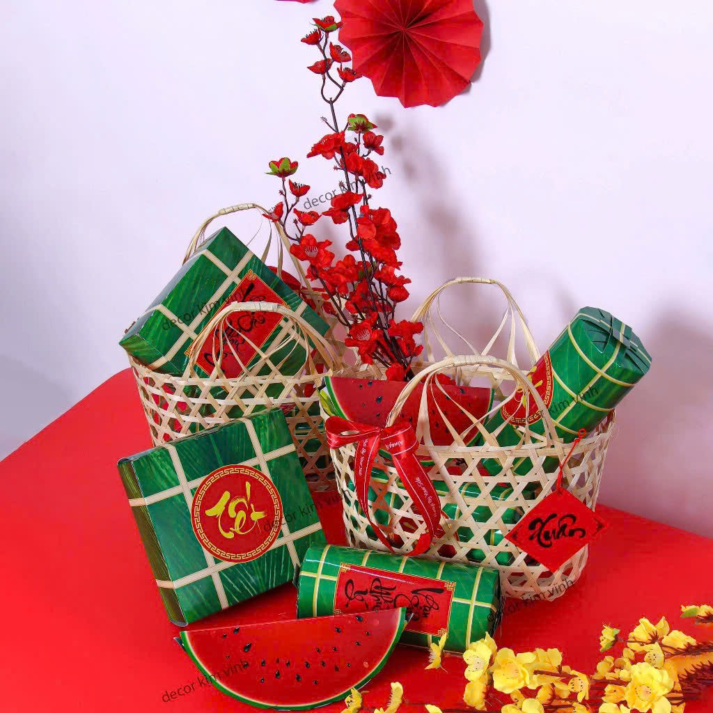+ Tên sản phẩm: Set Giỏ Quà Bánh Chưng Bánh Tét Dưa Hấu Tự Xếp Bằng Bìa Cứng Decor Mâm Quả Trang Trí Tết
