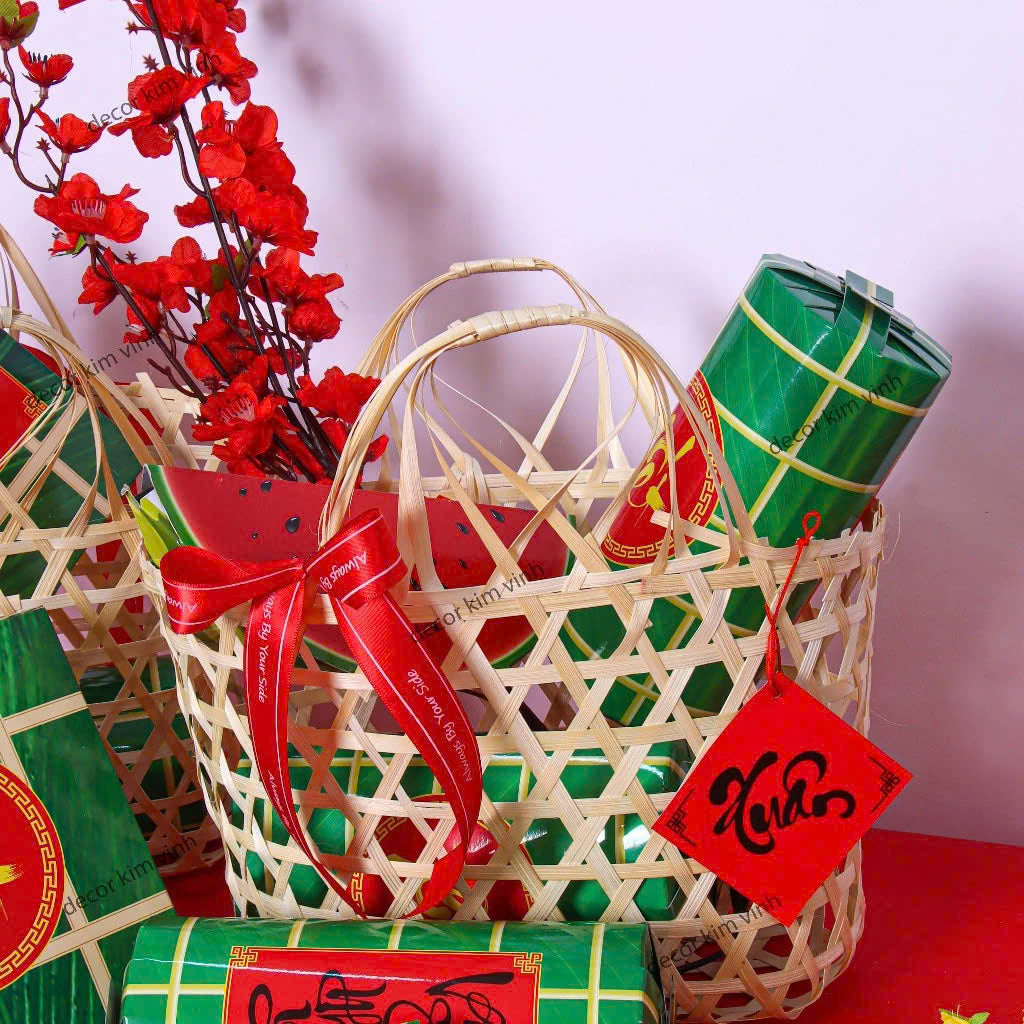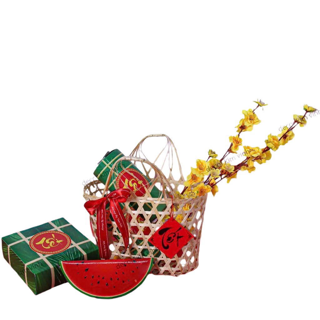 + Giá bán 1 set gồm: 1 Giỏ đan nứa đã trang trí (chữ ngẫu nhiên) / 1 Miếng dưa hấu / 1 Bánh Tét / 1 Bánh chưng / 1 Cành mai ( ĐỎ hoặc VÀNG)