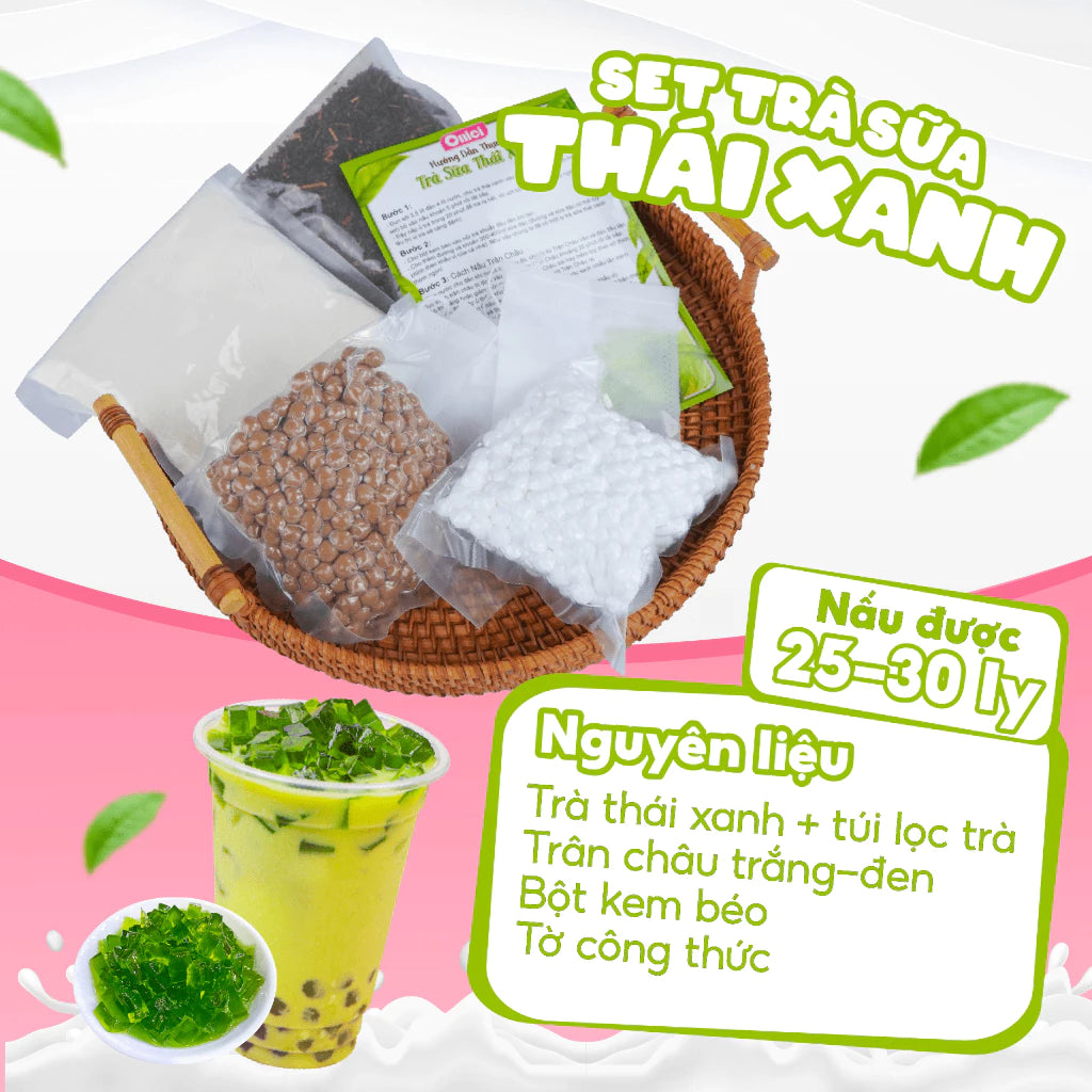 - Set trà sữa Thái Xanh: 1 túi bột kem béo, 1 túi trà thái xanh, 1 túi trân châu trắng, 1 túi trân châu đen