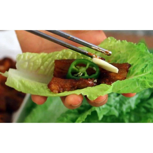 Nếu như thưởng thức món Samgyeopsal theo đúng kiểu Hàn Quốc là Những miếng thịt lợn ba chỉ dày, béo, dù không bao giờ được nêm nếm gia vị, được nướng trên một cái lò đặt tại bàn ăn đem đến một hương vị tuyệt vời khó cưỡng khi ăn kèm lá kinh giới mà thiếu đi kimchi và ssamjang (hỗn hợp bột đậu tương và tương ớt) thì coi như mất hẳn vị ngon của món này.