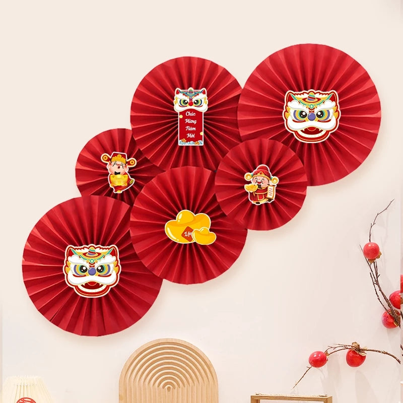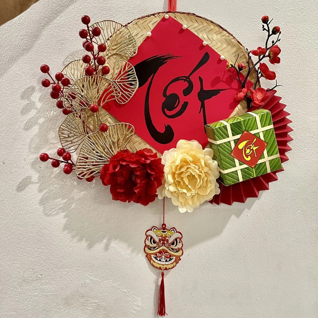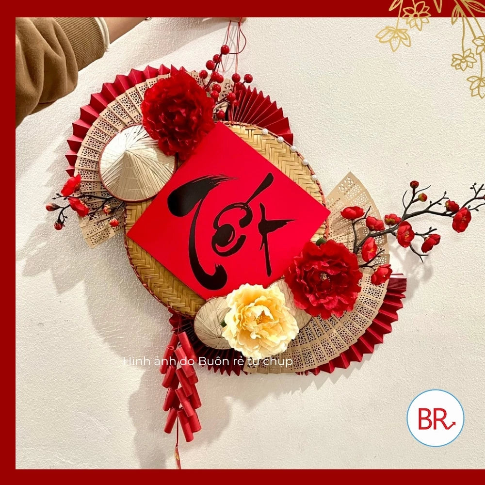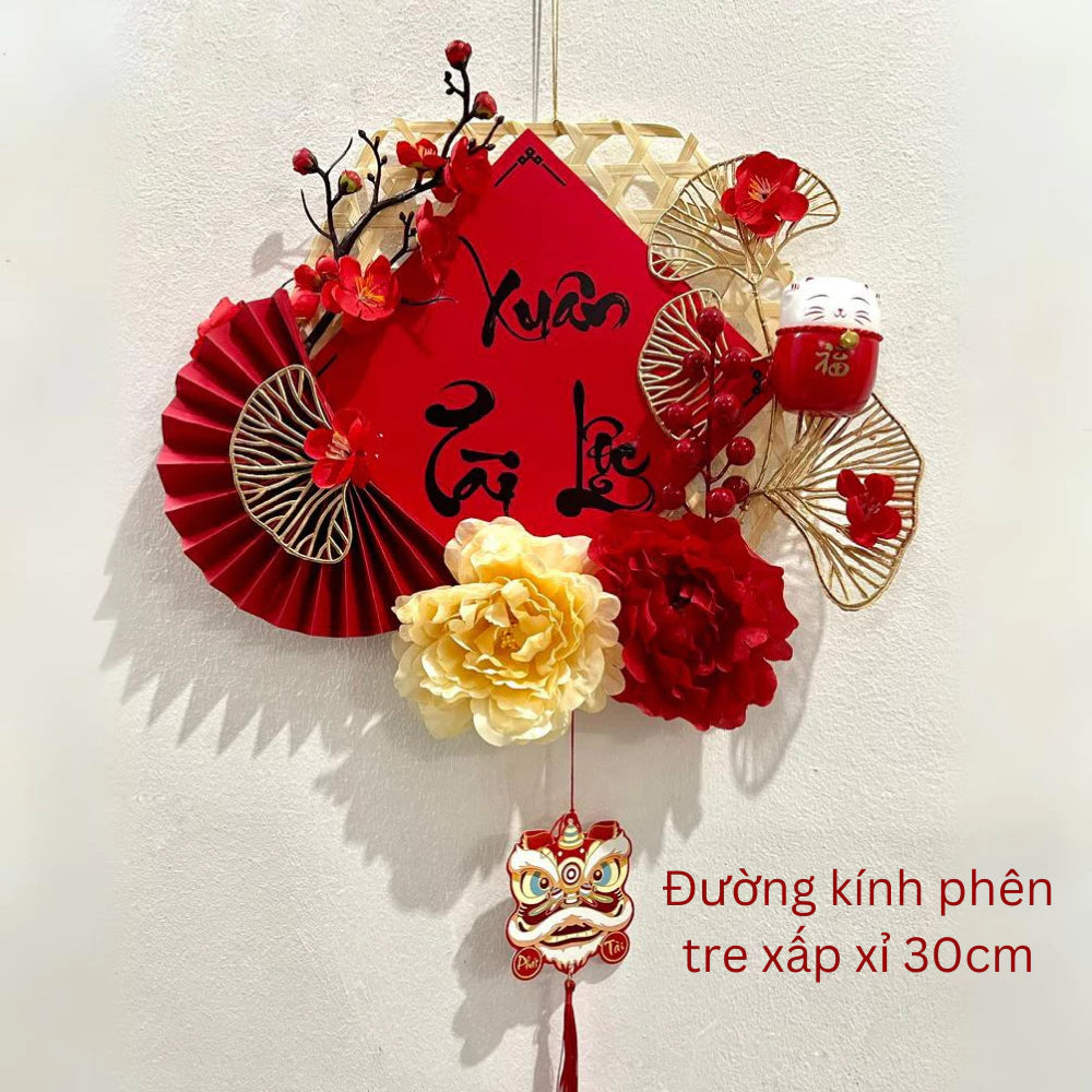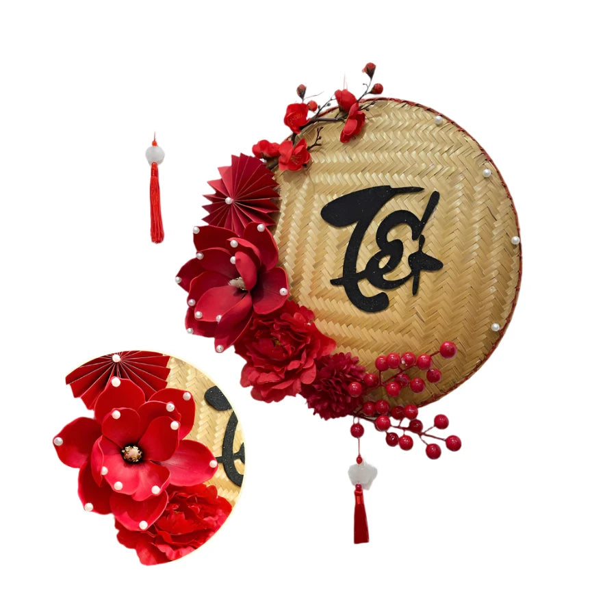 - Mẹt tre được trang trí thêm quạt đỏ, hoa đào, hoa mai cực kỳ bắt mắt và giúp tăng thêm không khí ngày tết, đậm chất xuân.