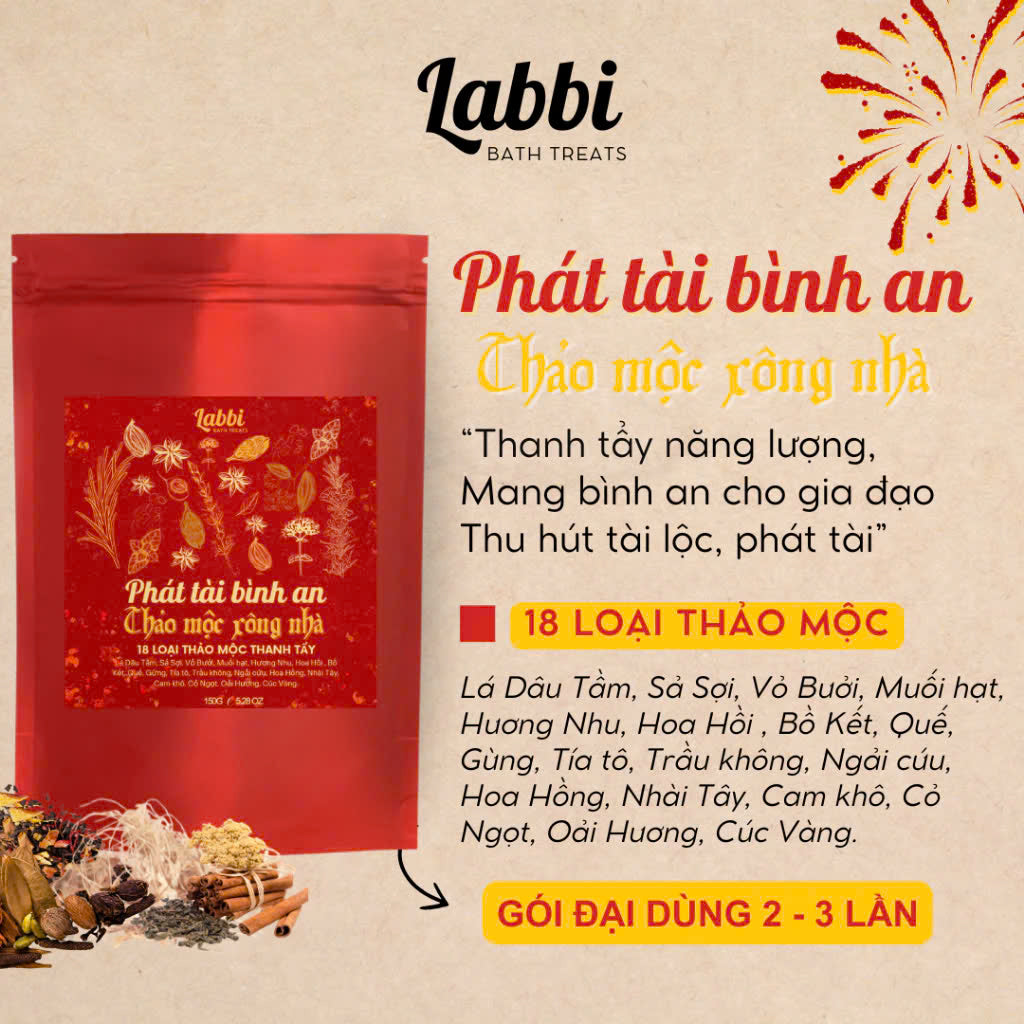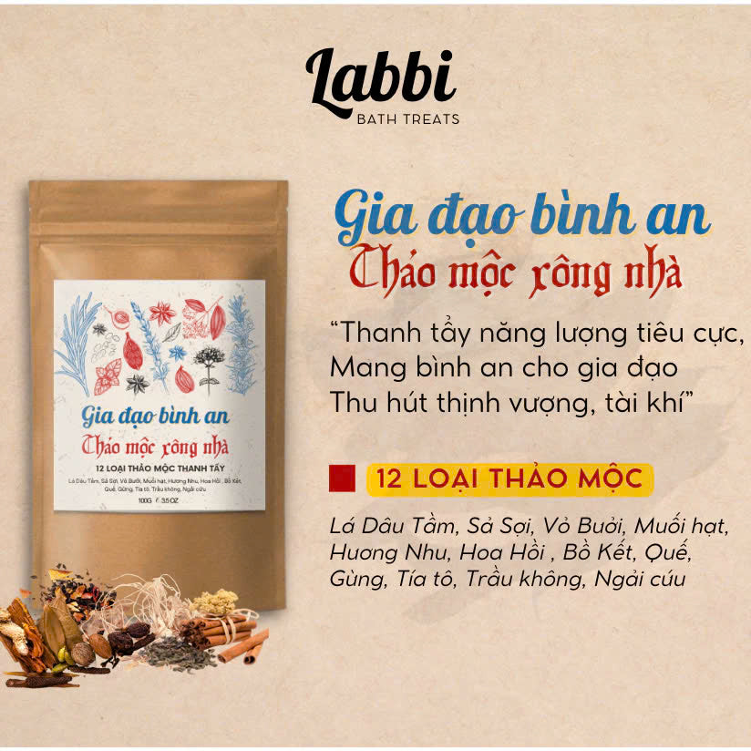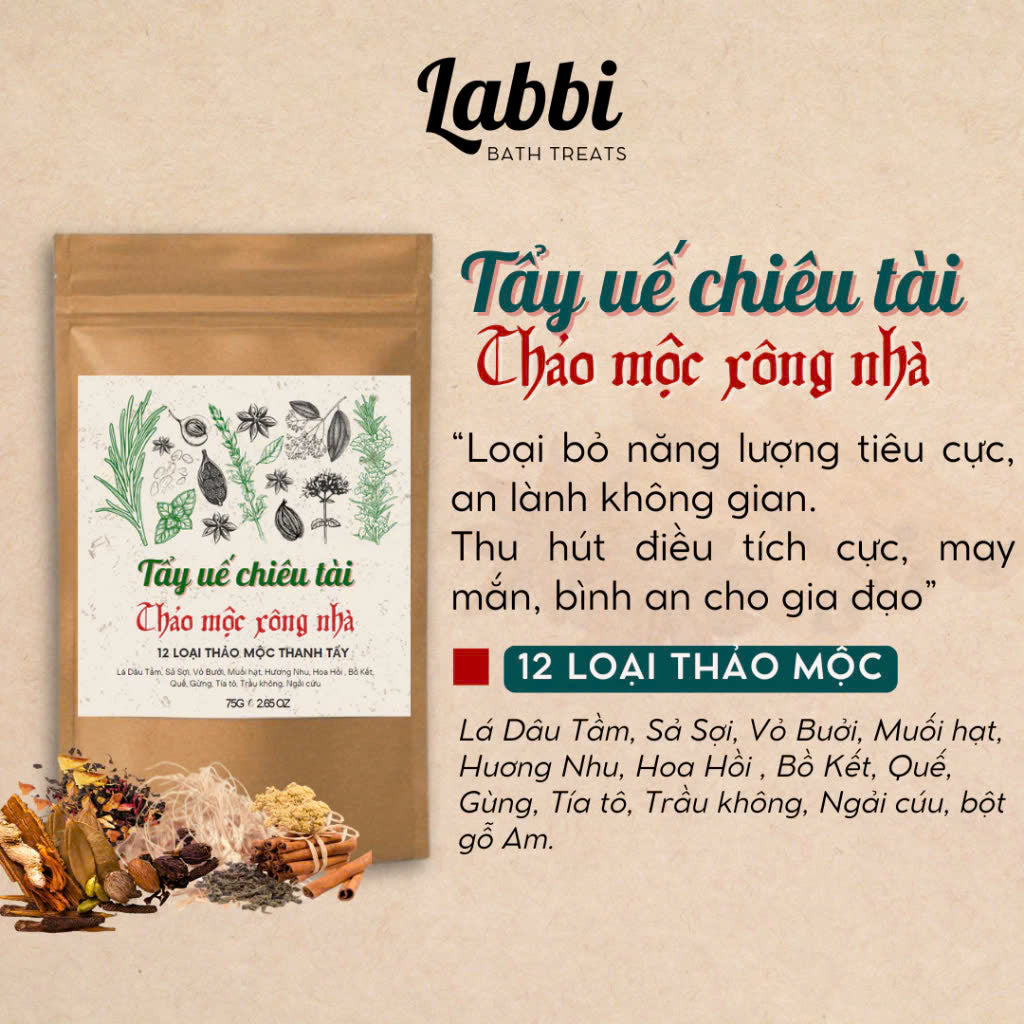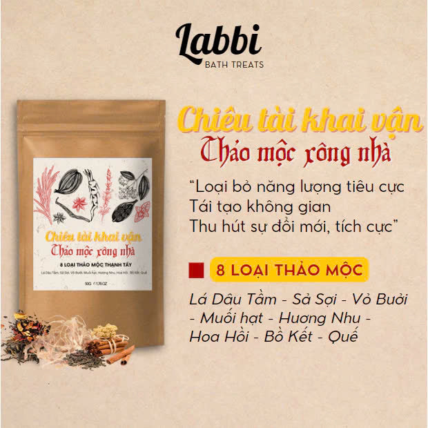 Thảo mộc xông nhà được kết hợp từ các thảo mộc như bồ kết, hoa nhài, hoa hồi, khuynh diệp, bạc hà, thảo quả, tô mộc, bưởi, tần bì, quế, gừng...