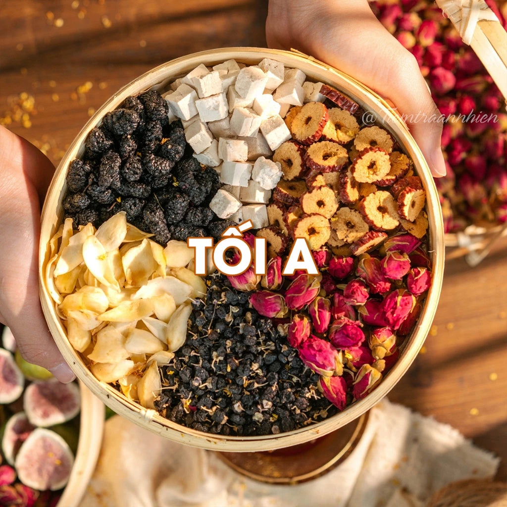 – Trà Chiều / Vitamin A : Bạch Phục Linh, Dâu Tằm, Hoa Huệ Tây, Táo đỏ, Hắc Kỷ Tử, Nụ Hồng